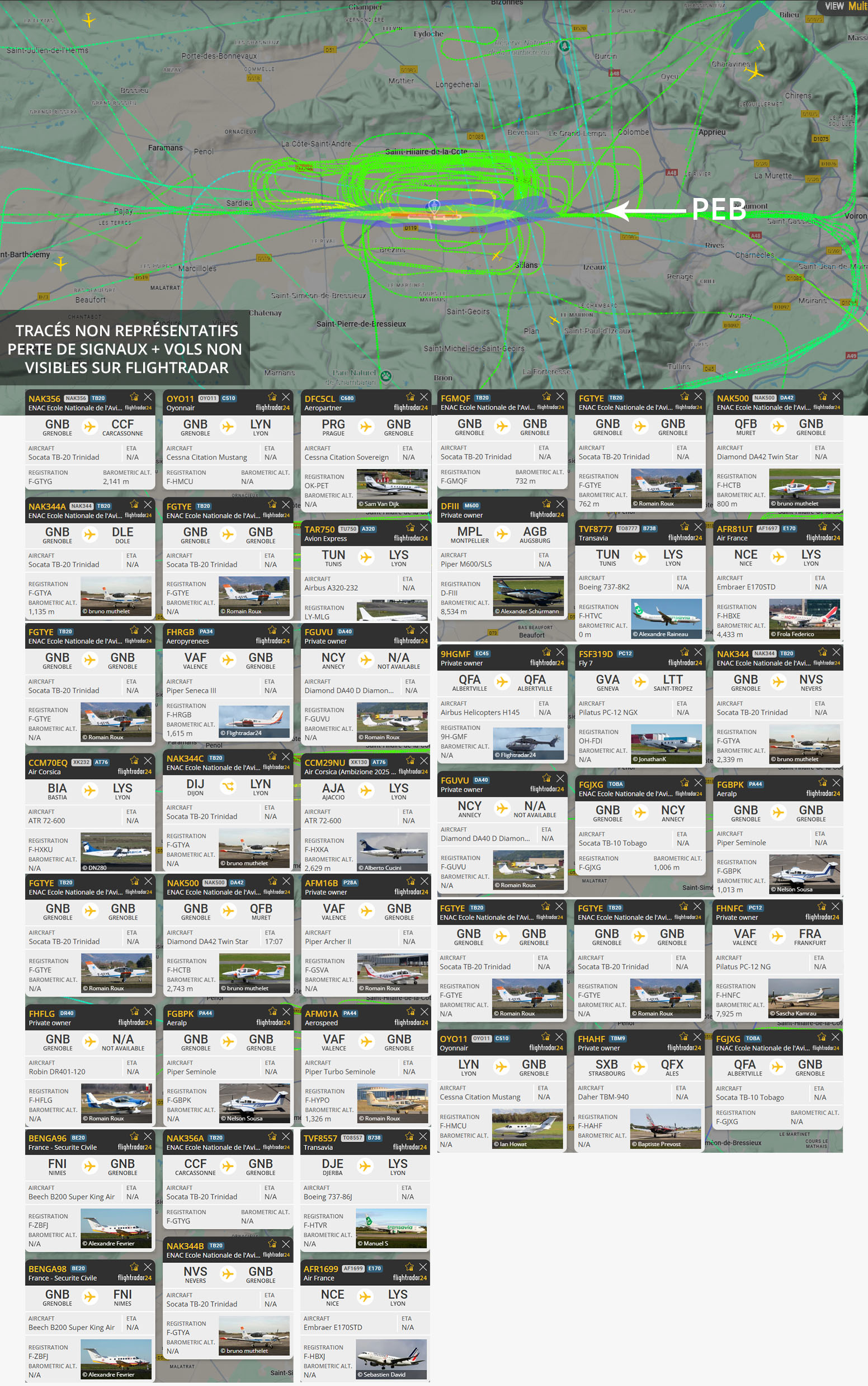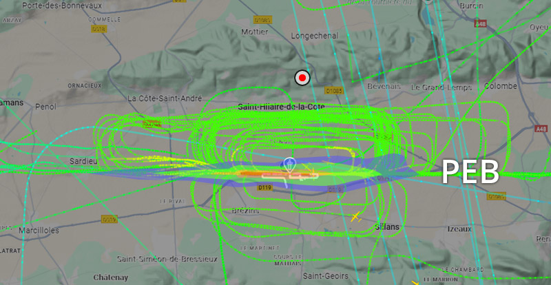 Visuel non représentatif de la réalité, perte fréquente de signaux et vols non visibles sur Flightradar. * PEB : Plan d’exposition au bruit, absolument non représentatif de la réalité.