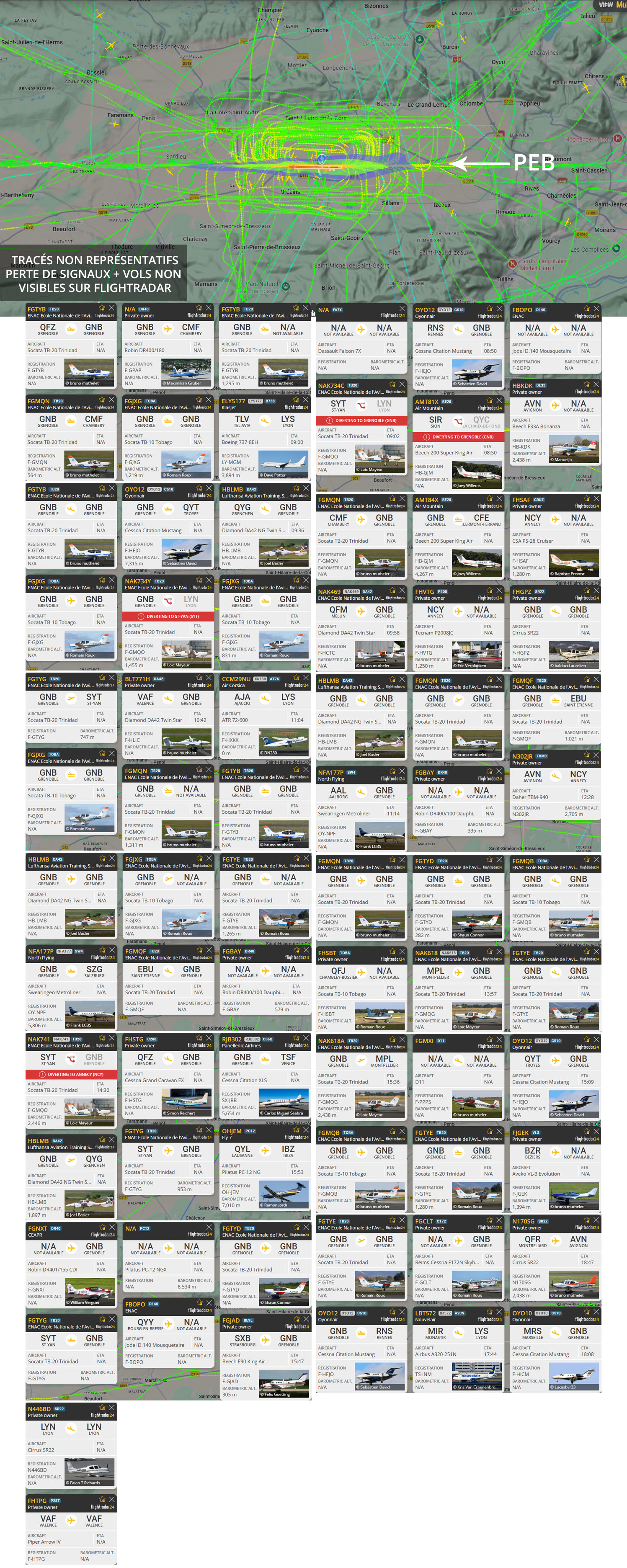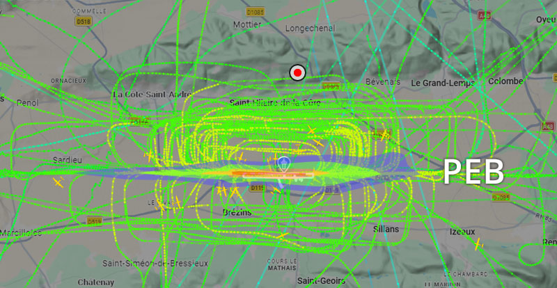 Visuel non représentatif de la réalité, perte fréquente de signaux et vols non visibles sur Flightradar. * PEB : Plan d’exposition au bruit, absolument non représentatif de la réalité.
