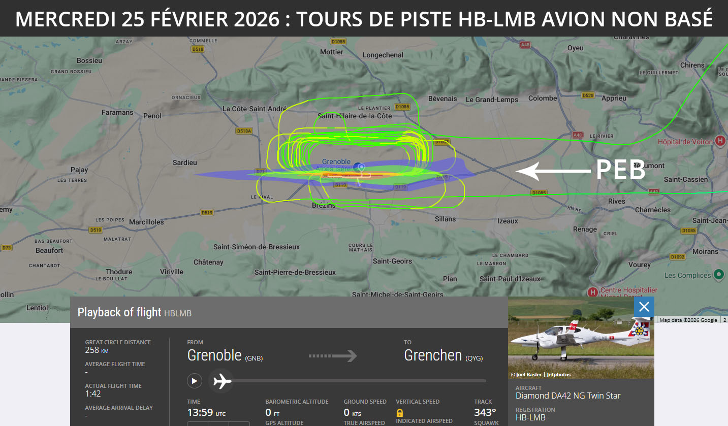 De grosses nuisances toute la journée, principalement jusqu’en fin d’après-midi. Des tours de piste majoritairement au nord de l’Enac (dont certains non visibles sur Flightradar), des tours de piste matin, midi, après-midi uniquement au nord du HB-LMB Lufthansa Aviation Training (Suisse), des tours de piste d’un Dassault Falcon 7X avec passages systématiques sur les hauteurs, des tours de piste d’avions non visibles sur Flightradar (comme les tours de piste de l’aéroclub du Dauphiné F-GNXT ou de l’aéroclub de Vienne F-PPPS). Pourquoi avons nous des Suisses qui viennent s’entrainer ici ? Pourquoi avons nous autant d’avions non basés qui viennent faire des tours de piste ici ? Non ce n’est pas normal !!! Des nuisances de nombreux aéroclubs non basés (F-HVTG Annecy, F-GPAP Chambéry, F-HGPZ et F-HSTG Grenoble le Versoud, F-HLIC Valence, F-PPPS aéroclub de Vienne, F-JGEK N/A, F-GCLT Avnir Aviation Lyon Bron, N170SG N/A, F-GBAY Morestel, et le soir avec tours de piste F-HTPG Valence, N446BD Lyon Bron) et basés (aéroclub du Dauphiné F-GNXT, F-GJAD GEA). Des nuisances d’avions en approche sur Lyon, d’avions et de jets en direction ou en partance d’ici, d’Oyonnair et d’avions non visibles sur Flightradar.