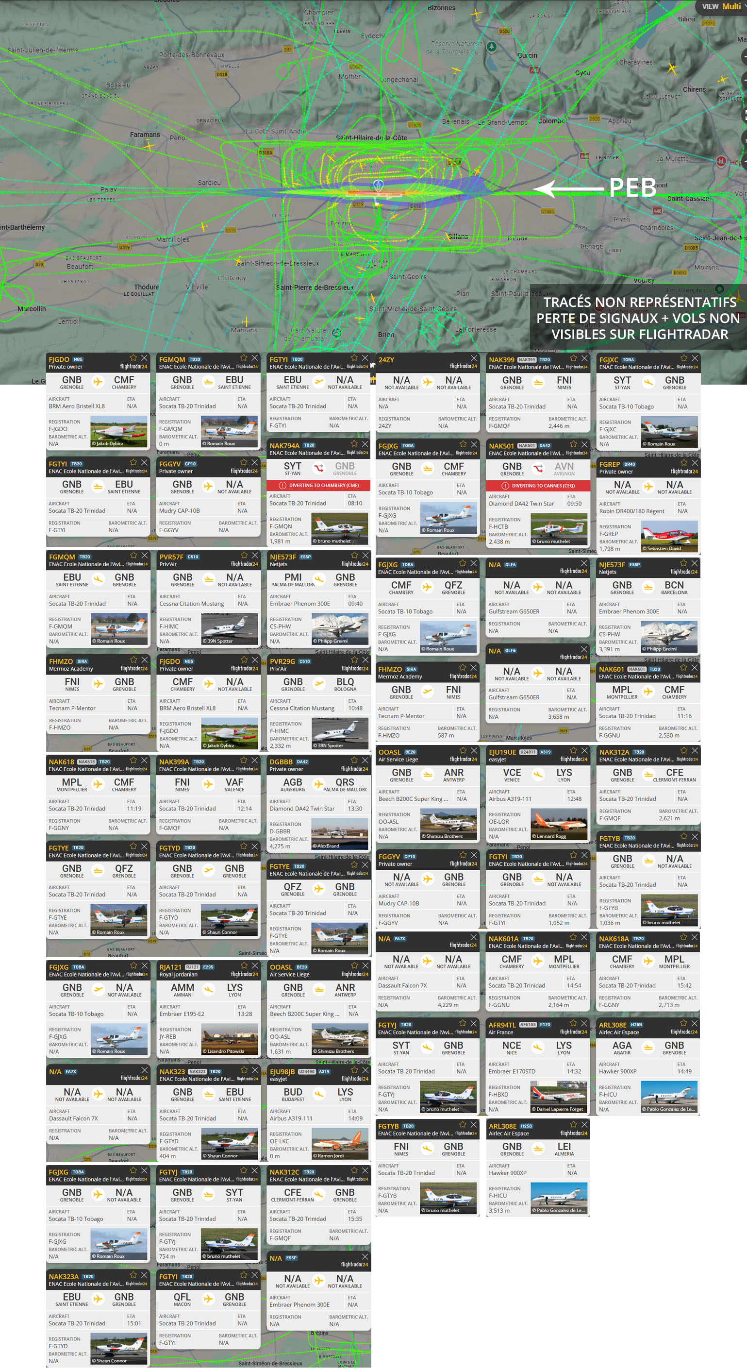 Visuel non représentatif de la réalité, perte fréquente de signaux et vols non visibles sur Flightradar. * PEB : Plan d’exposition au bruit, absolument non représentatif de la réalité.