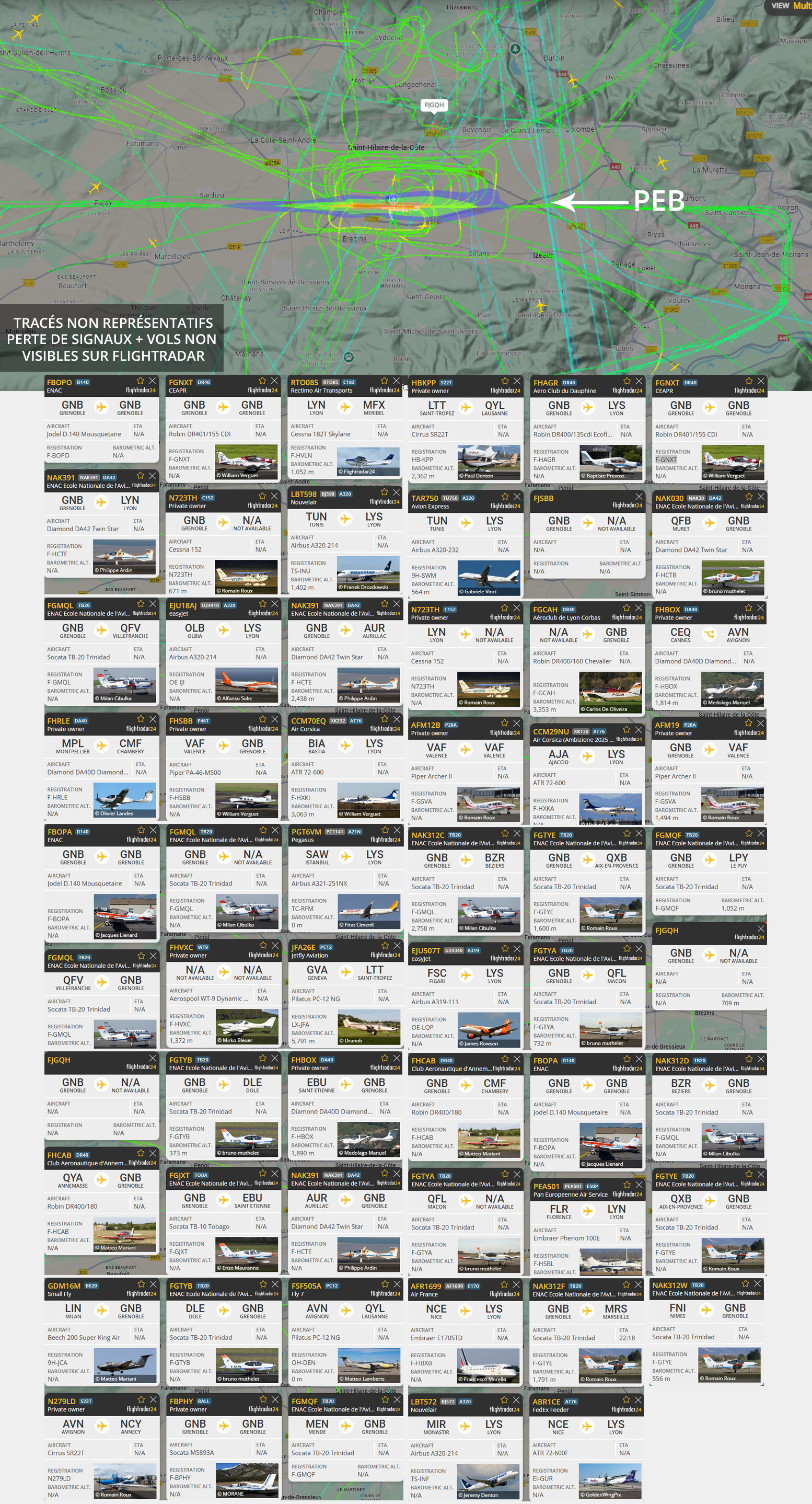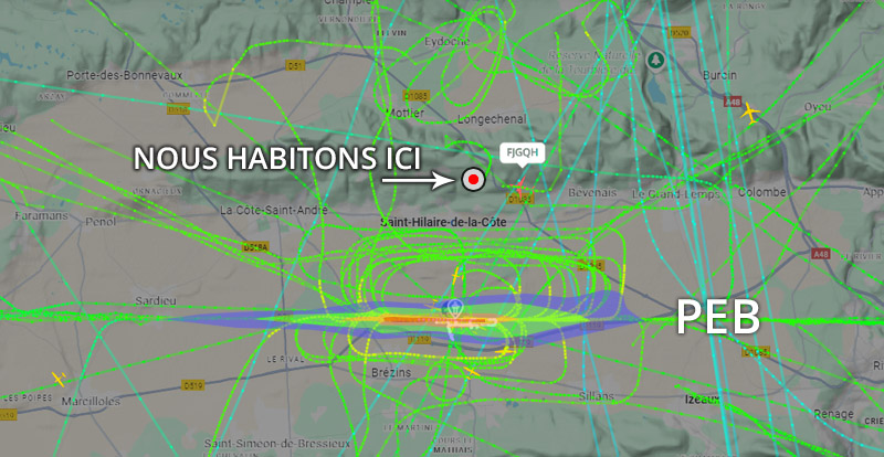 Visuel non représentatif de la réalité, perte fréquente de signaux et vols non visibles sur Flightradar. * PEB : Plan d’exposition au bruit, absolument non représentatif de la réalité.
