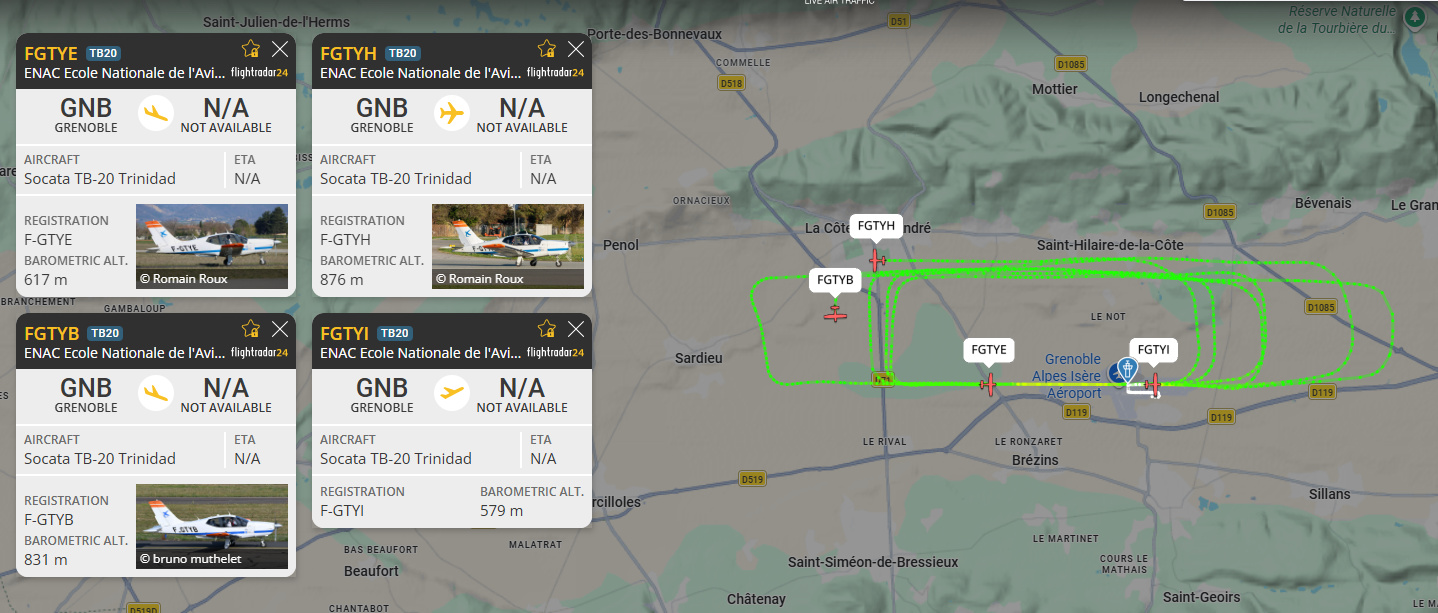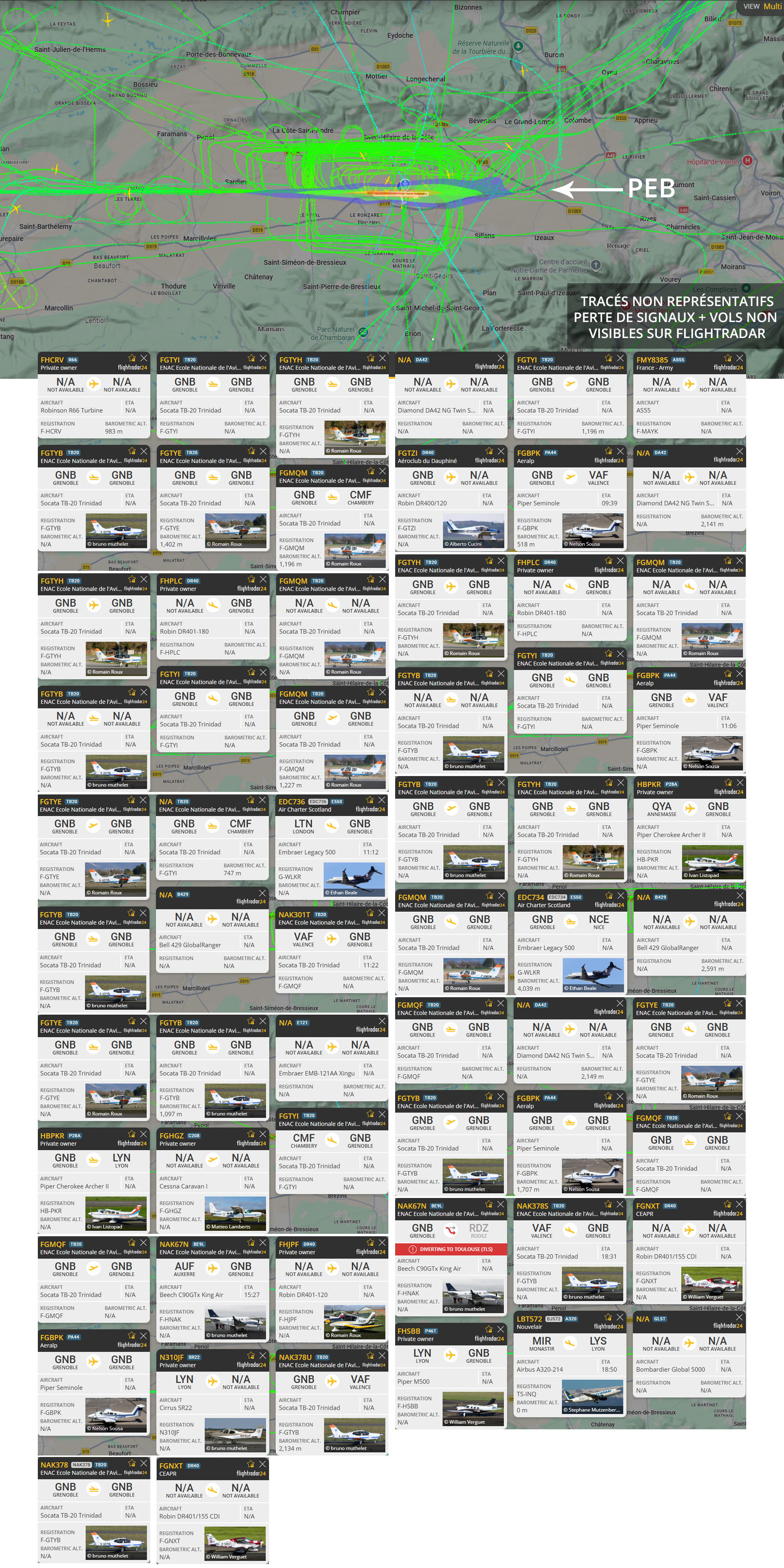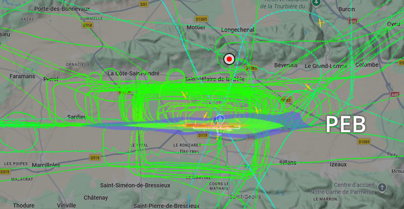 Visuel non représentatif de la réalité, perte fréquente de signaux et vols non visibles sur Flightradar. * PEB : Plan d’exposition au bruit, absolument non représentatif de la réalité.