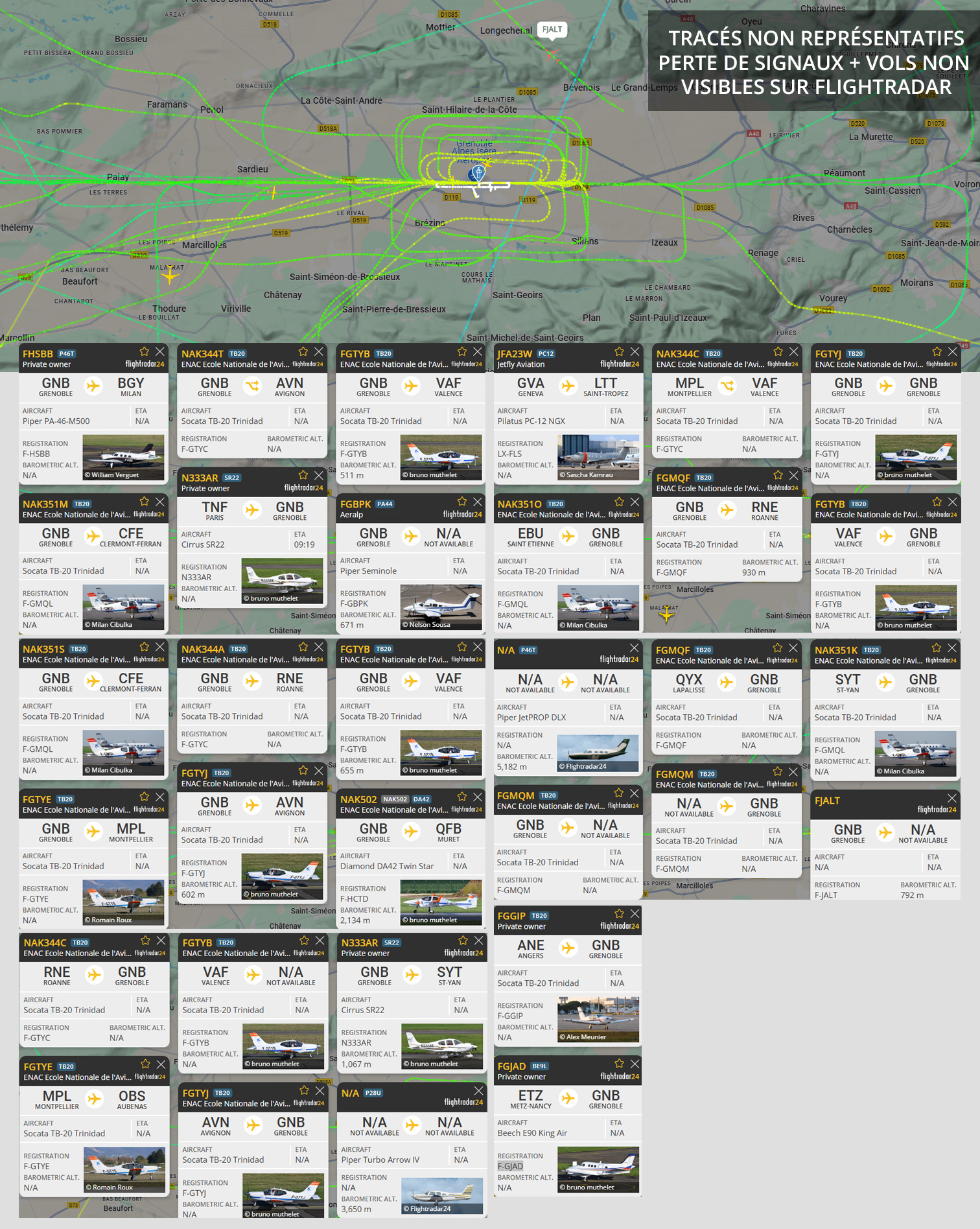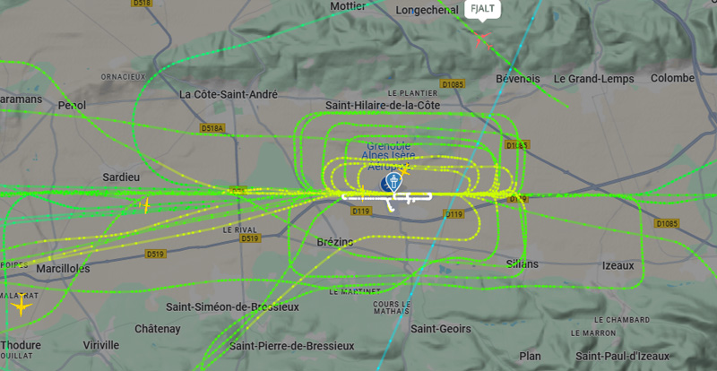Peu de nuisances grâce à la météo. Mais toujours des tours de piste… Visuel non représentatif de la réalité, perte fréquente de signaux et vols non visibles sur Flightradar.