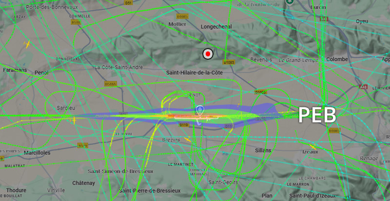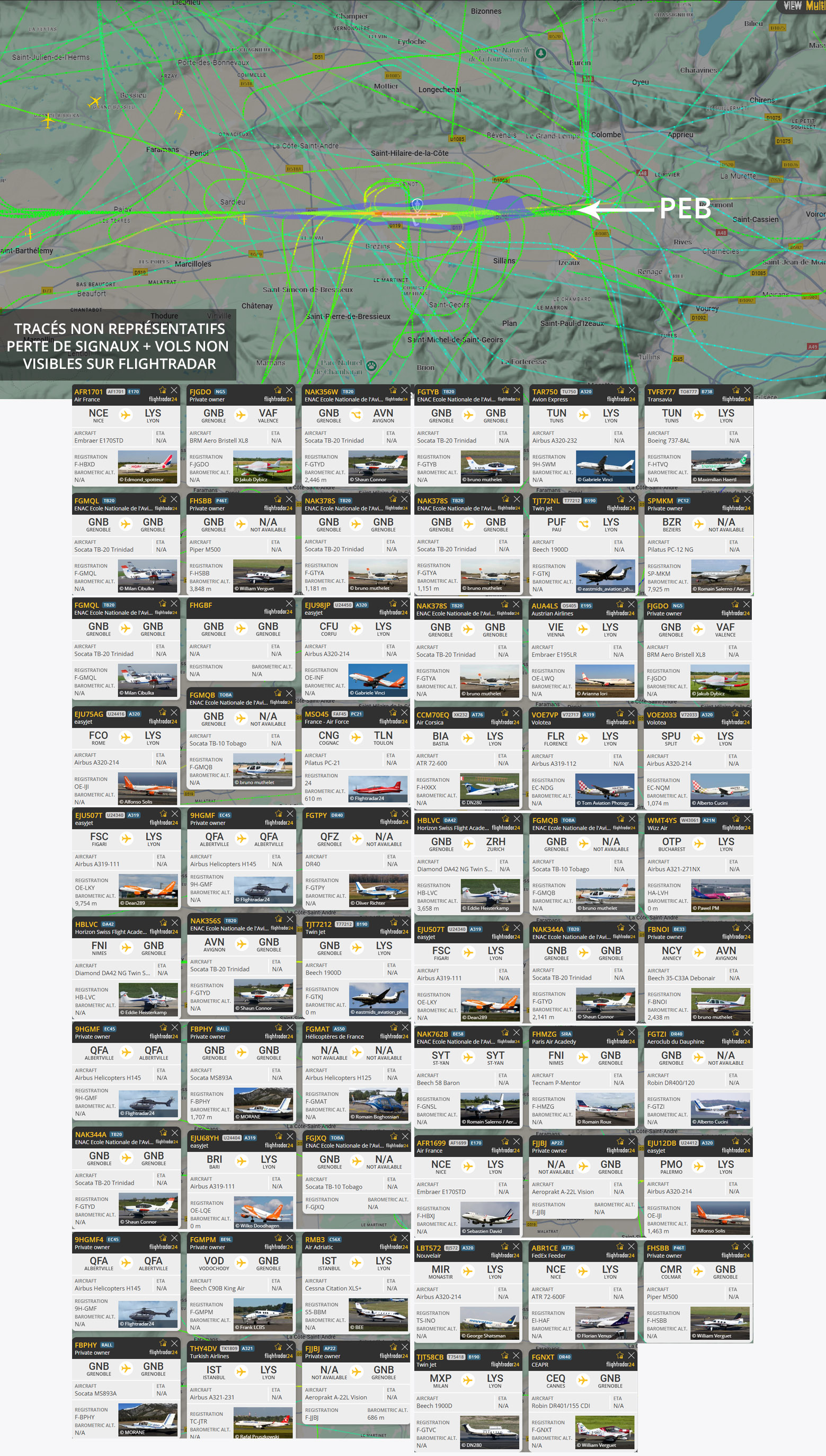Visuel non représentatif de la réalité, perte fréquente de signaux et vols non visibles sur Flightradar. * PEB : Plan d’exposition au bruit, absolument non représentatif de la réalité.