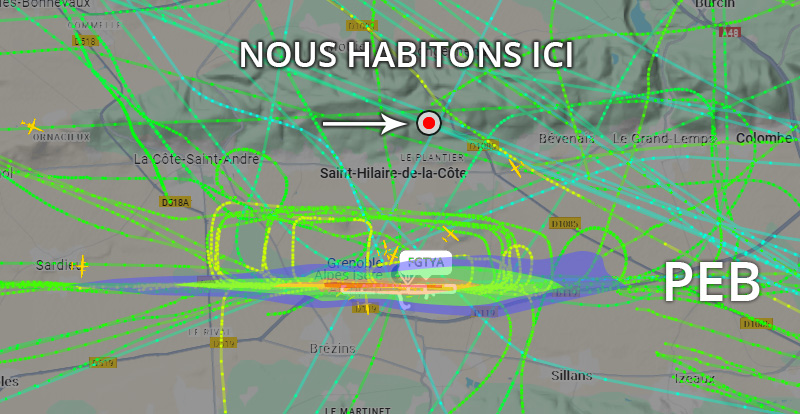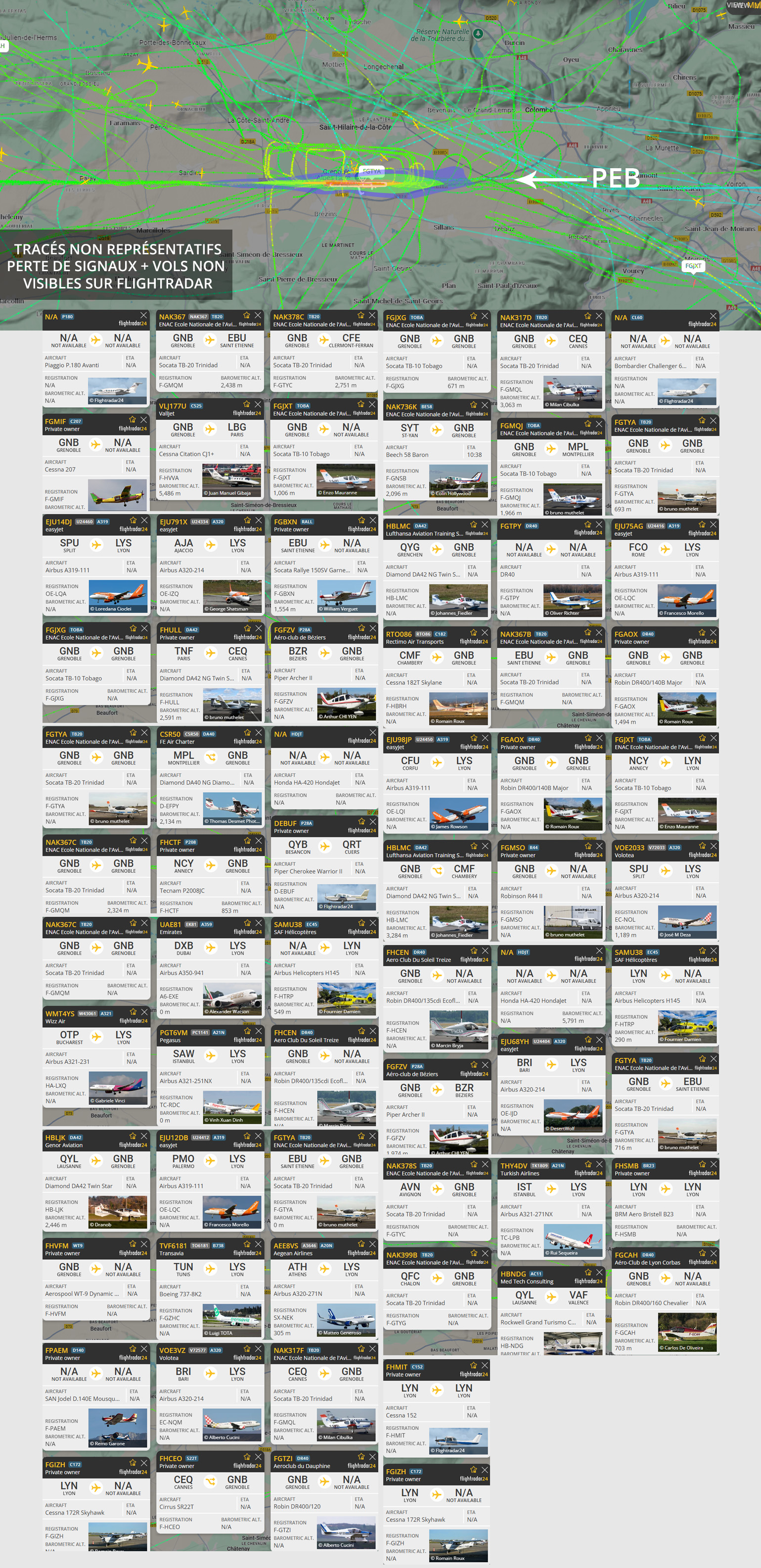 Visuel non représentatif de la réalité, perte fréquente de signaux et vols non visibles sur Flightradar. * PEB : Plan d’exposition au bruit, absolument non représentatif de la réalité.