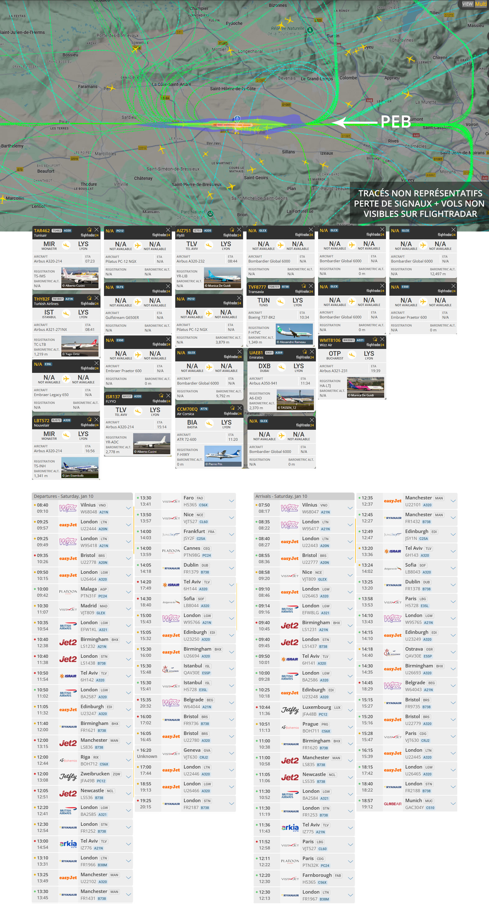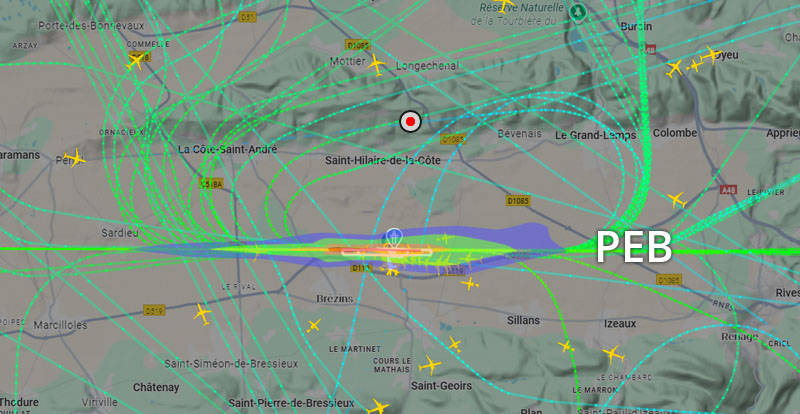 Visuel non représentatif de la réalité, perte fréquente de signaux et vols non visibles sur Flightradar. * PEB : Plan d’exposition au bruit, absolument non représentatif de la réalité.