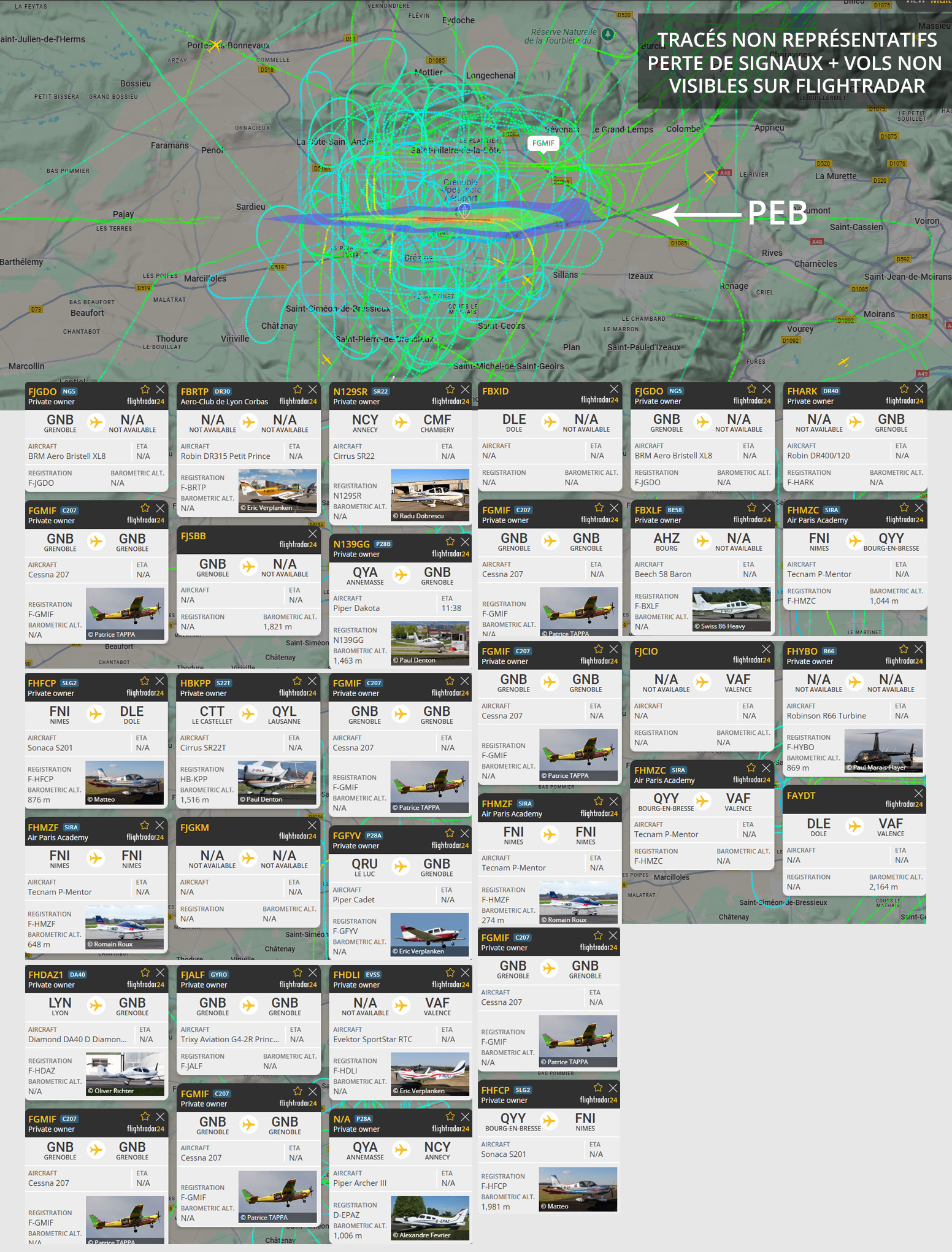 Que faut-il faire pour être pris en considération ? Quand est-ce que les élus vont réagir ? Au moins prendre le temps de répondre à UNE plainte ? Visuel non représentatif de la réalité, perte fréquente de signaux et vols non visibles sur Flightradar. * PEB : Plan d’exposition au bruit, absolument non représentatif de la réalité.