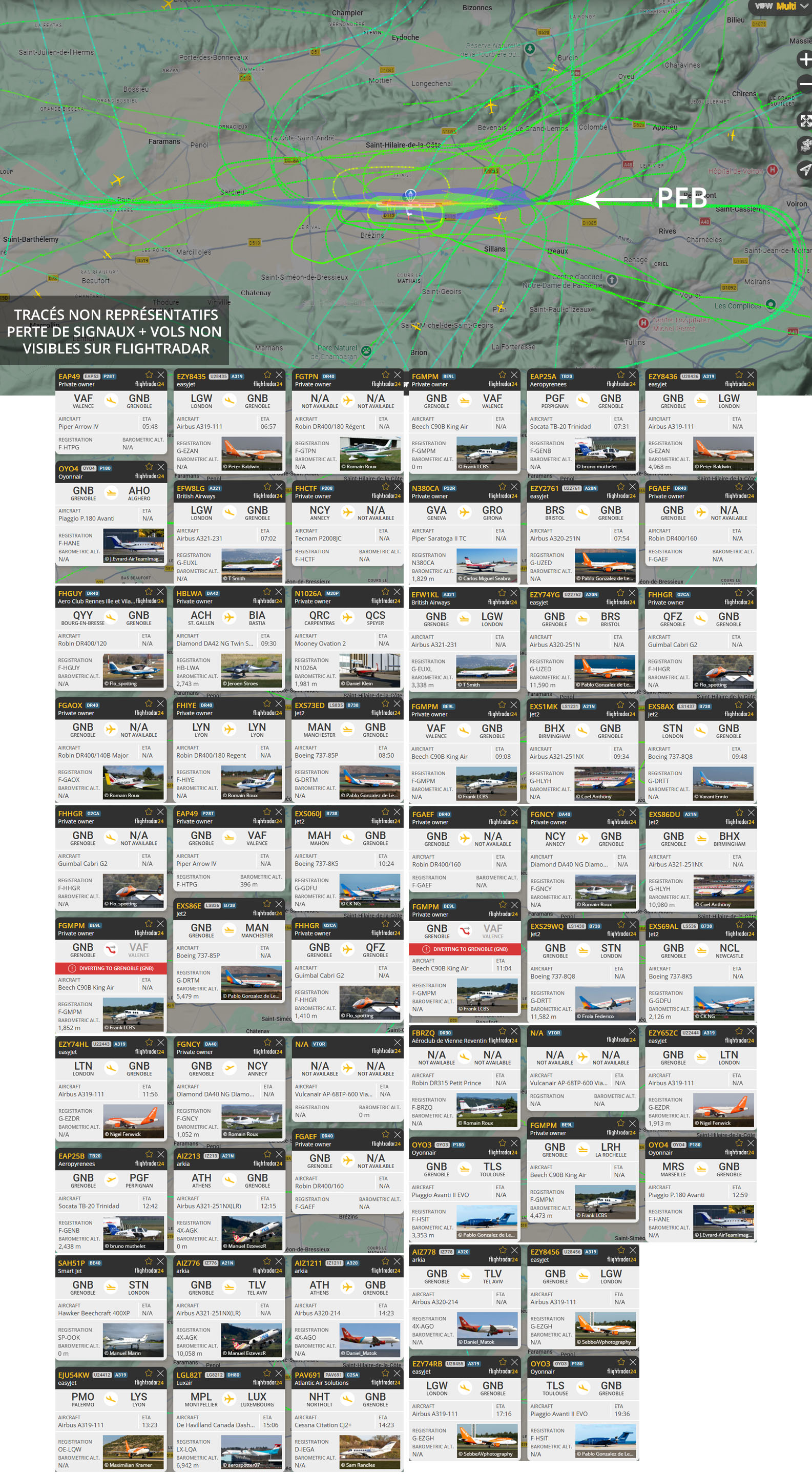 Visuel non représentatif de la réalité, perte fréquente de signaux et vols non visibles sur Flightradar. * PEB : Plan d’exposition au bruit, absolument non représentatif de la réalité.