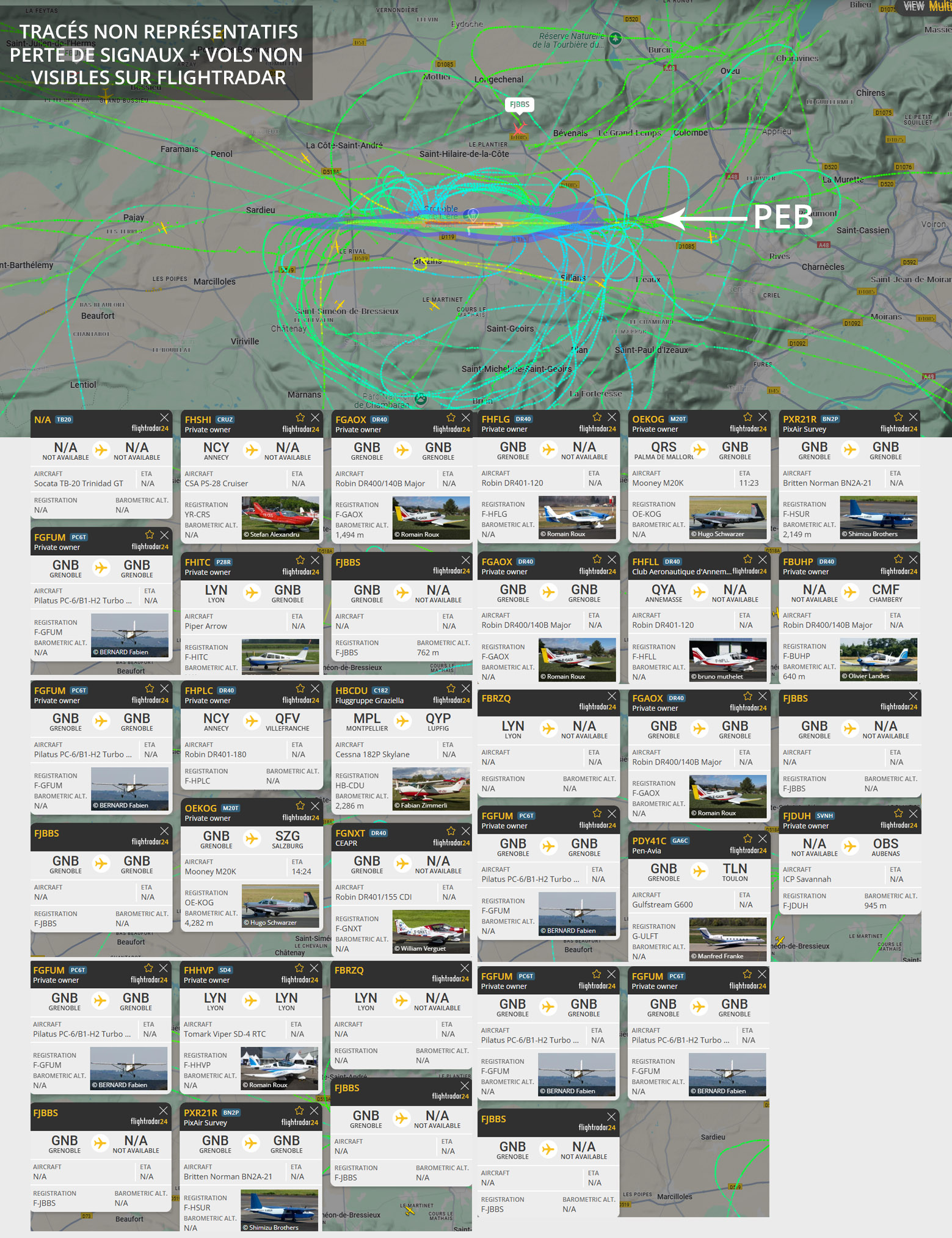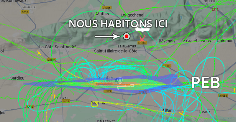 Visuel non représentatif de la réalité, perte fréquente de signaux et vols non visibles sur Flightradar. * PEB : Plan d’exposition au bruit, absolument non représentatif de la réalité