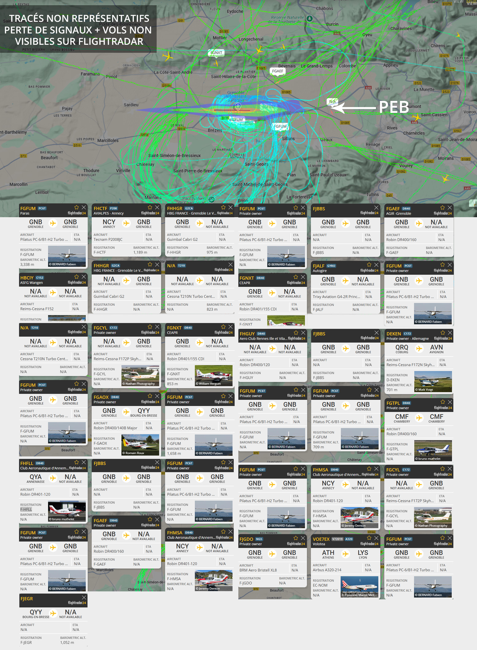 Visuel non représentatif de la réalité, perte fréquente de signaux et vols non visibles sur Flightradar. * PEB : Plan d’exposition au bruit, absolument non représentatif de la réalité.