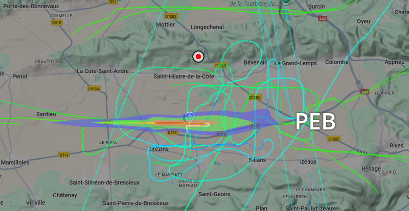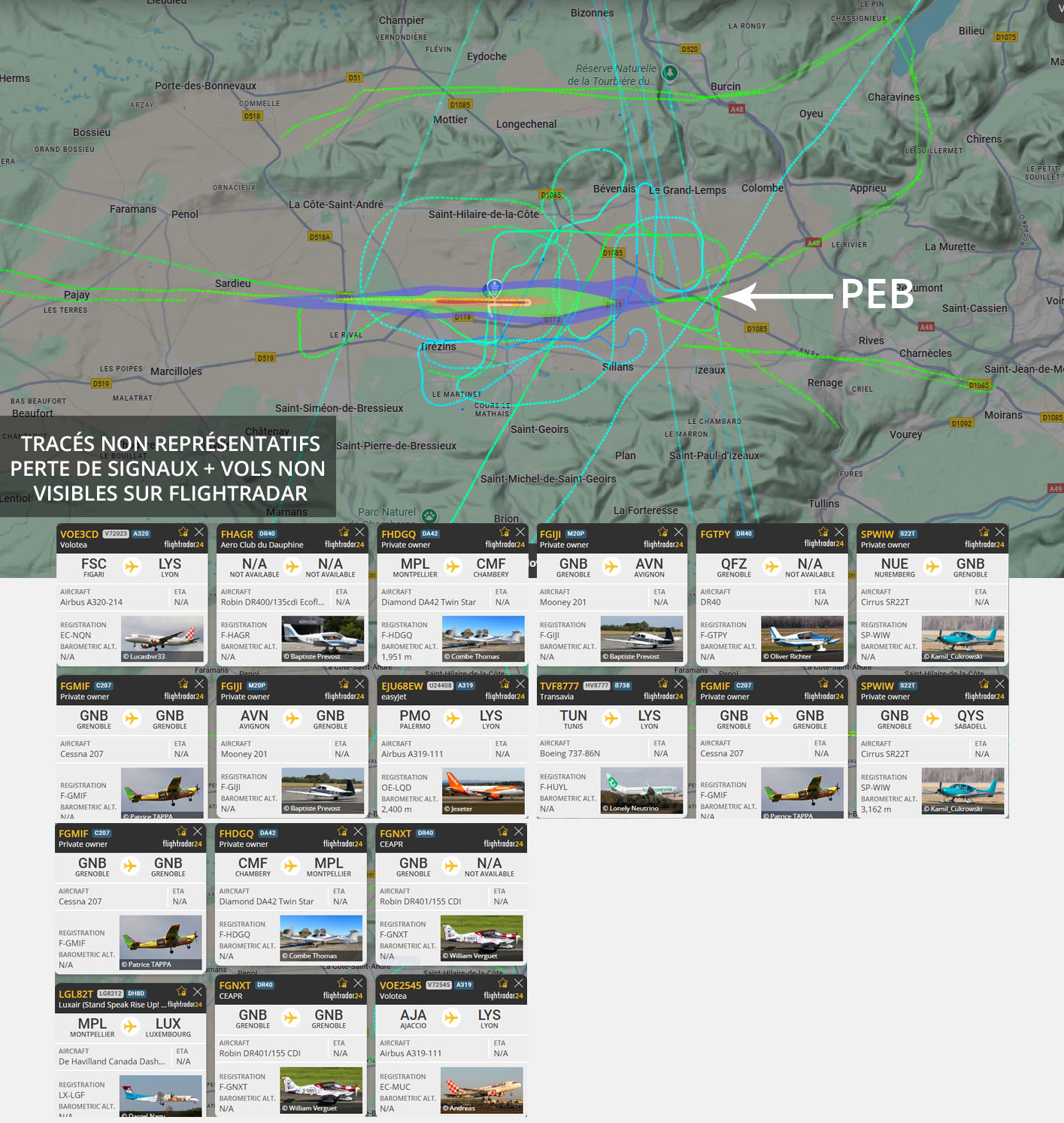 Visuel non représentatif de la réalité, perte fréquente de signaux et vols non visibles sur Flightradar. * PEB : Plan d’exposition au bruit, absolument non représentatif de la réalité.
