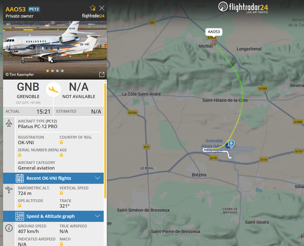 Une très grosse nuisance du Pilatus OK-VNI à 15h22 qui a décollé en effectuant directement son virage : ces avions là ne doivent ils pas atteindre une certaine altitude avant d’effectuer un virage après leur décollage ? Tout cela pour quelques minutes de vol, vu qu’il a atterri à Lyon St-Ex.