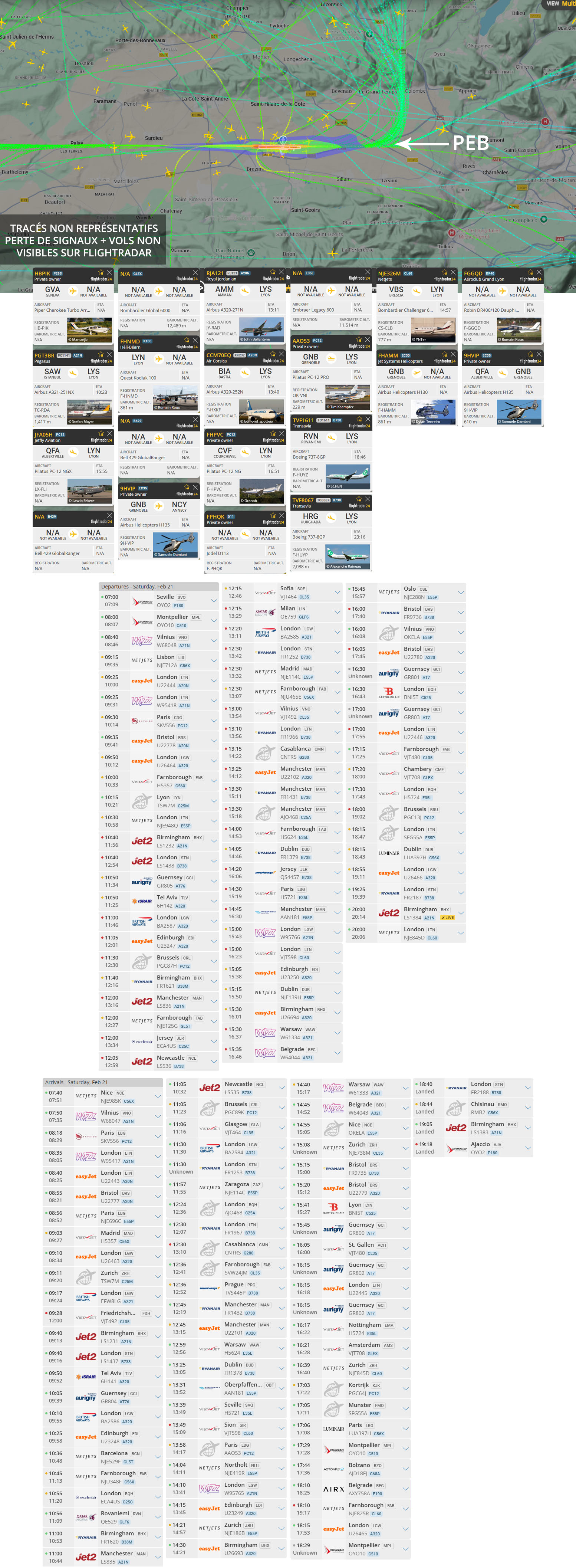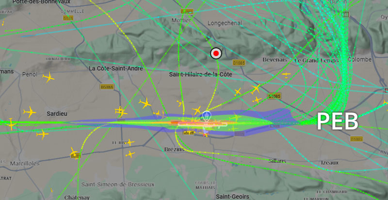 Visuel non représentatif de la réalité, perte fréquente de signaux et vols non visibles sur Flightradar. * PEB : Plan d’exposition au bruit, absolument non représentatif de la réalité.