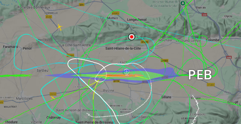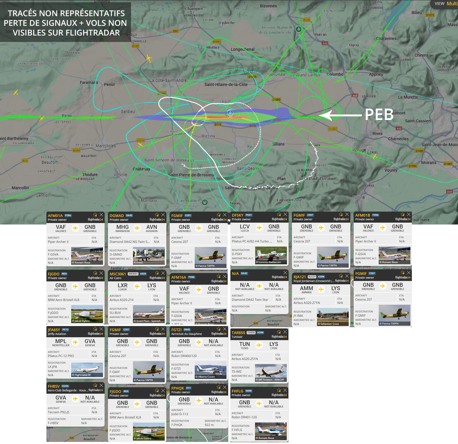 Visuel non représentatif de la réalité, perte fréquente de signaux et vols non visibles sur Flightradar. * PEB : Plan d’exposition au bruit, absolument non représentatif de la réalité.