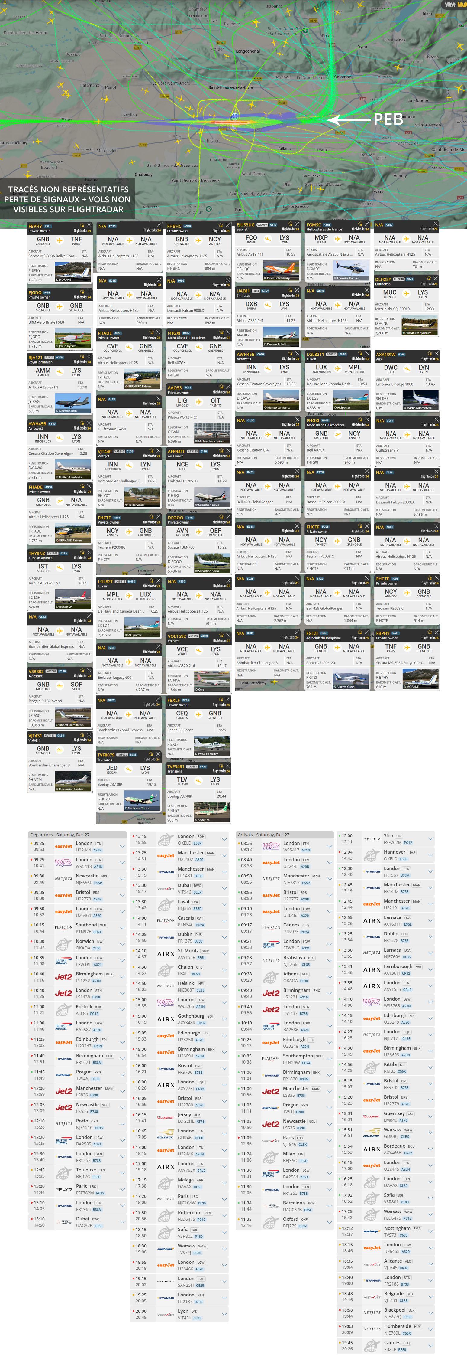 Visuel non représentatif de la réalité, perte fréquente de signaux et vols non visibles sur Flightradar. * PEB : Plan d’exposition au bruit, absolument non représentatif de la réalité.