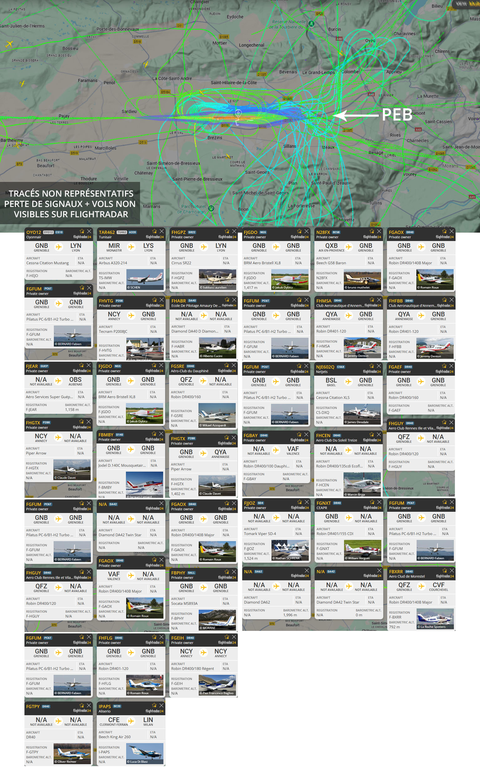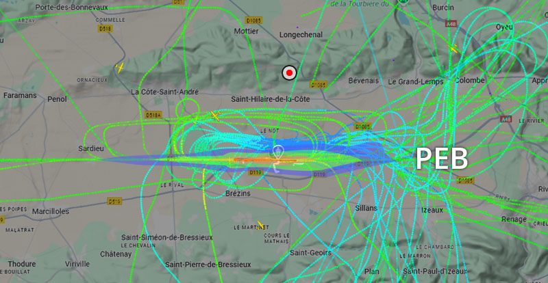 Visuel non représentatif de la réalité, perte fréquente de signaux et vols non visibles sur Flightradar. * PEB : Plan d’exposition au bruit, absolument non représentatif de la réalité.