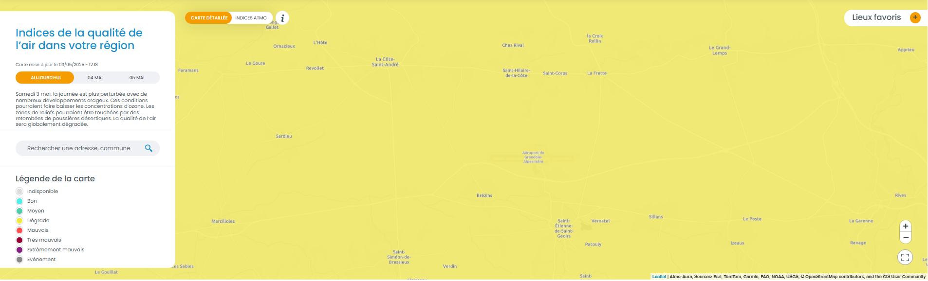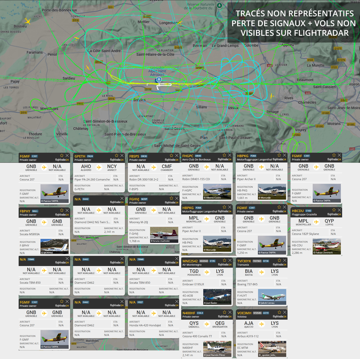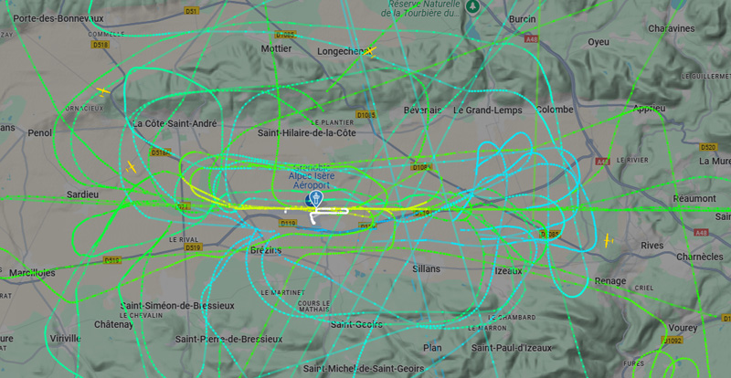 Des nuisances soutenues le matin avec des tours de piste de Morane Aero et des vols des parachutistes F-GMIF. Des nuisances également le midi et l’après-midi (passage bas sur les hauteurs d’un Diamond DA62 (immatriculation non visible), du F-BSPS (LES AMIS DU CENTRE LAIC D’AVIATION POPULAIRE DE SAVOIE C.L.A.P. Chambéry), passages de F-GMIF (parachtutistes), approches sur Lyon…). Visuel non représentatif de la réalité, perte fréquente de signaux et vol non visibles sur Flightradar.