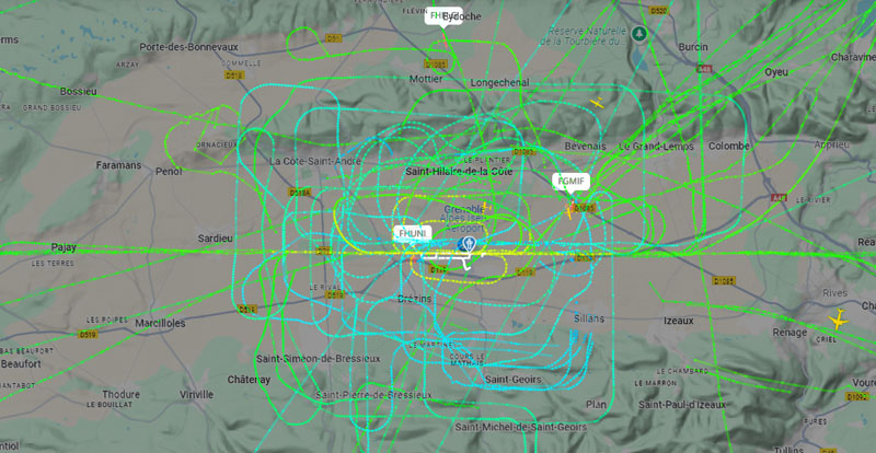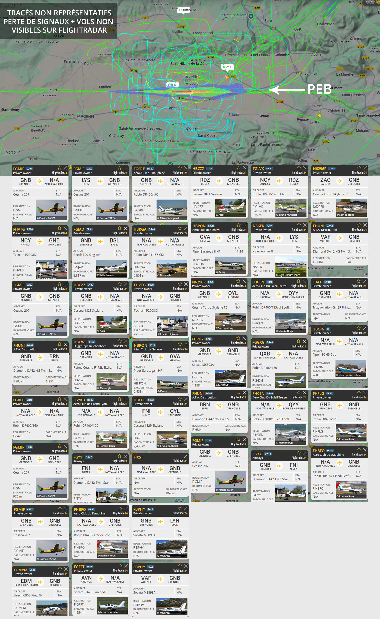 Visuel non représentatif de la réalité, perte fréquente de signaux et vols non visibles sur Flightradar. * PEB : Plan d’exposition au bruit, absolument non représentatif de la réalité.