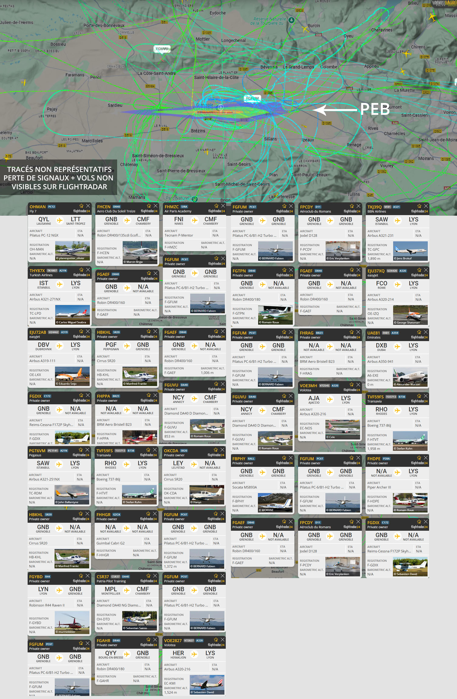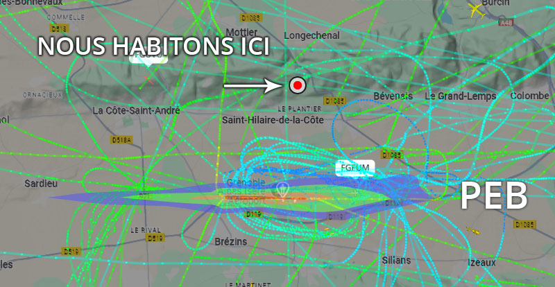 Visuel non représentatif de la réalité, perte fréquente de signaux et vols non visibles sur Flightradar. * PEB : Plan d’exposition au bruit, absolument non représentatif de la réalité.