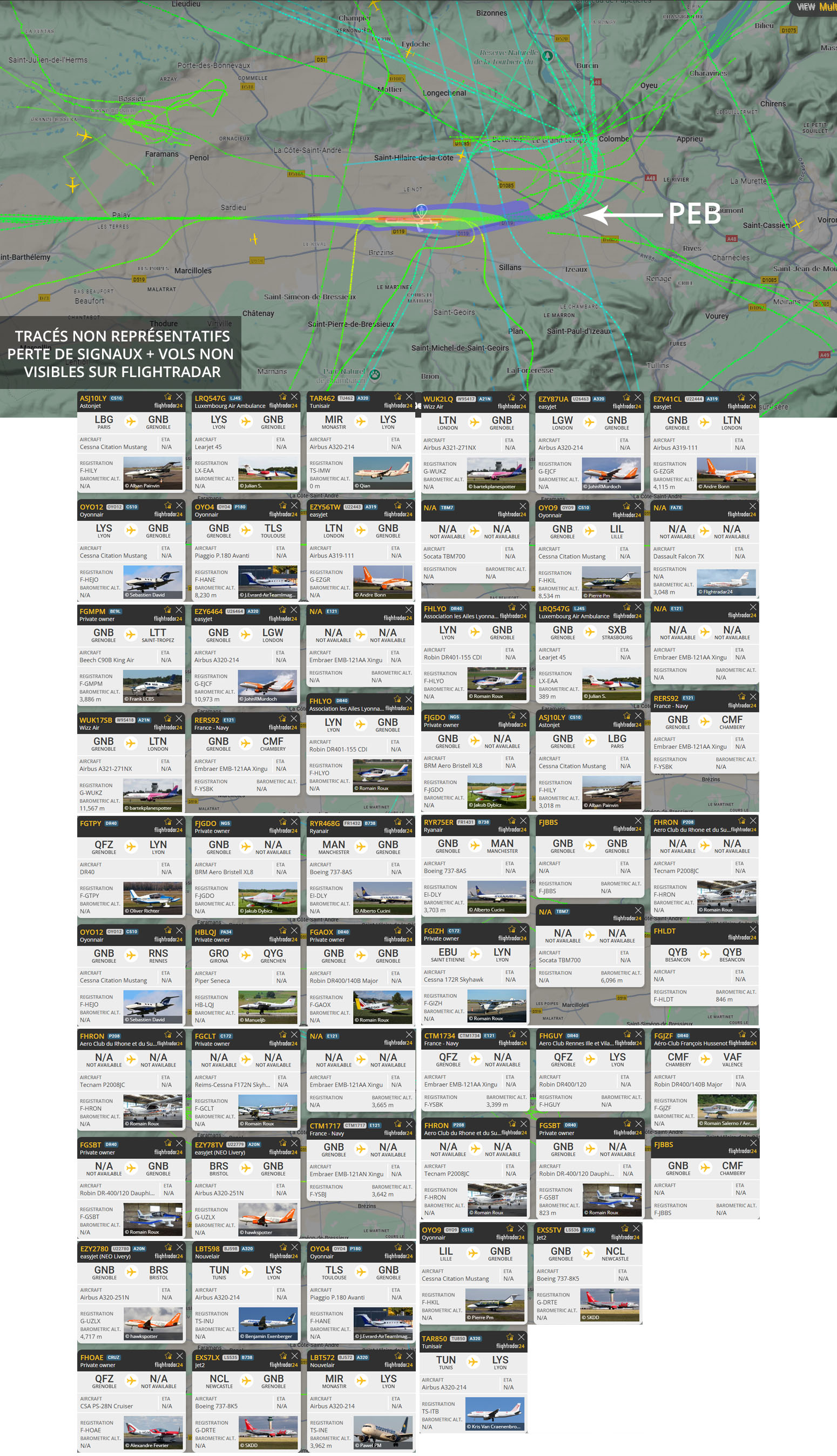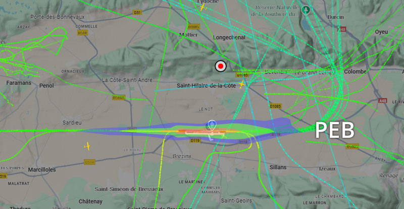 Visuel non représentatif de la réalité, perte fréquente de signaux et vols non visibles sur Flightradar. * PEB : Plan d’exposition au bruit, absolument non représentatif de la réalité.