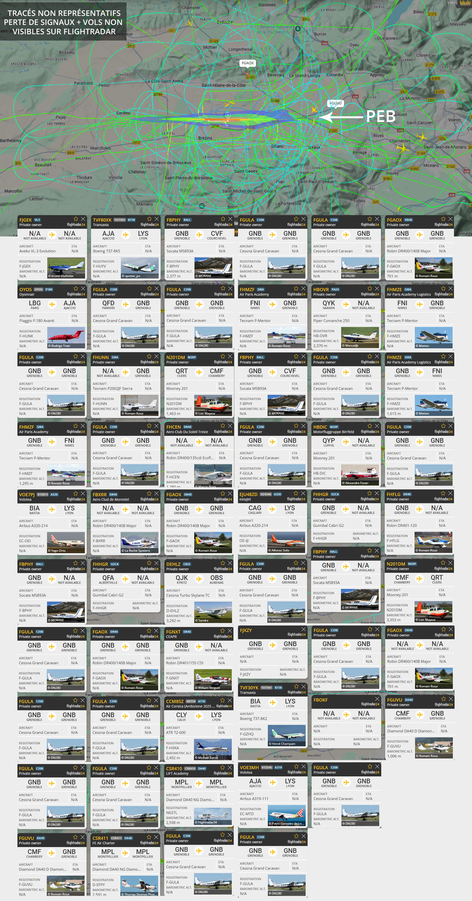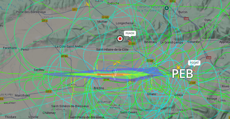 Visuel non représentatif de la réalité, perte fréquente de signaux et vols non visibles sur Flightradar. * PEB : Plan d’exposition au bruit, absolument non représentatif de la réalité.
