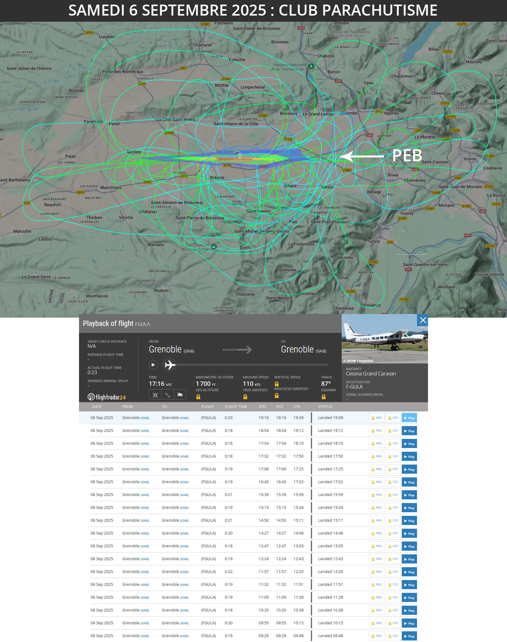 Des nuisances toute la journée. Nuisances du club de parachutisme avec un avion encore plus bruyant que d’habitude (Cessna Grand Caravan) pour encore une fois, une compétition (le loisir avant tout le reste). De nombreux passages sur les hauteurs et un bruit constant vu que cet avion s’entend sur au moins 20km… Des nuisances des aéroclubs, basés et non basés, avec des passages sur les hauteurs. Des nuisances avec quelques tours de piste également.