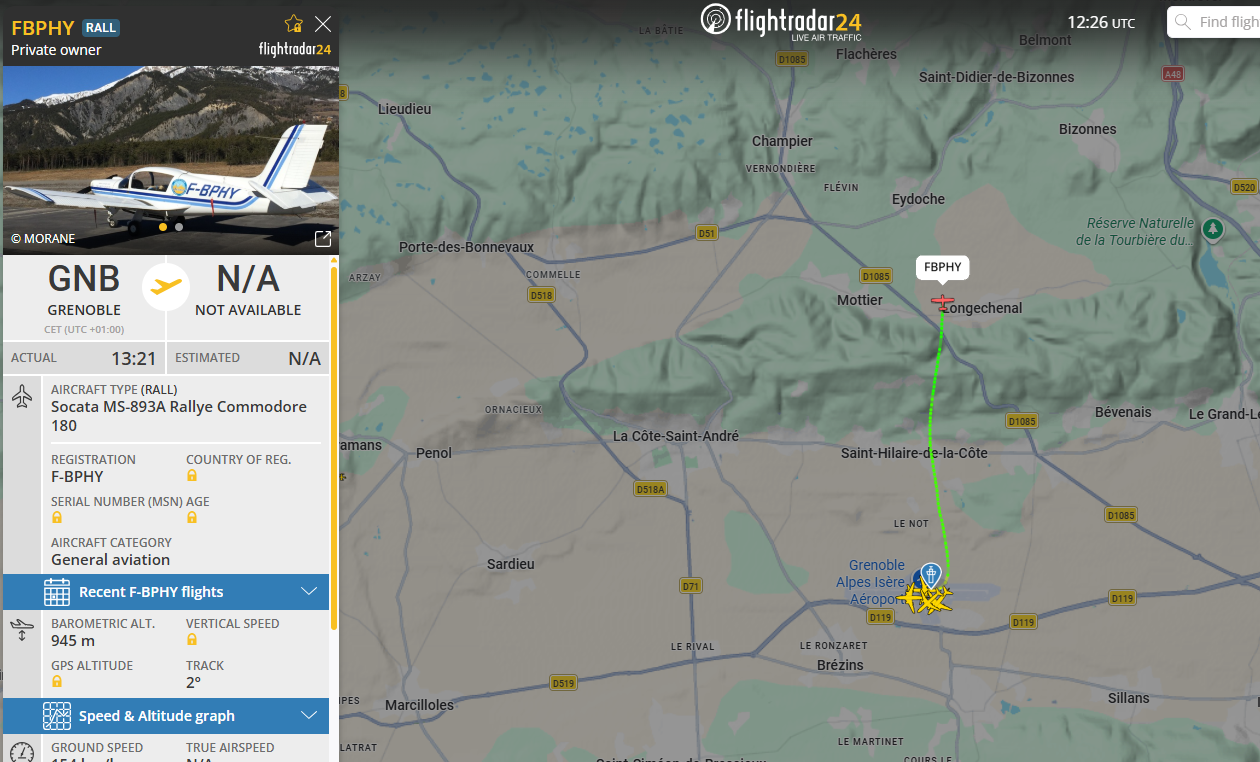 Question : pourquoi un décollage du F-BPHY (Morane, basé ici) et un virage direct sur les hauteurs alors que cet avion allait beaucoup plus à l’est (Chamonix) ? Pourquoi ne pas suivre l’axe de la piste ? L’aéroport clame qu’il n’y a pas d’habitations dans l’axe de la piste, mais les avions ne respectent pas cet axe…