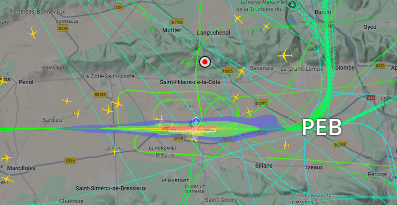 Visuel non représentatif de la réalité, perte fréquente de signaux et vols non visibles sur Flightradar. * PEB : Plan d’exposition au bruit, absolument non représentatif de la réalité.