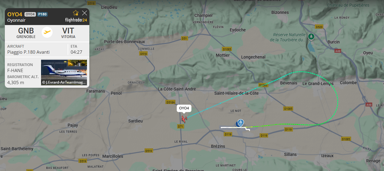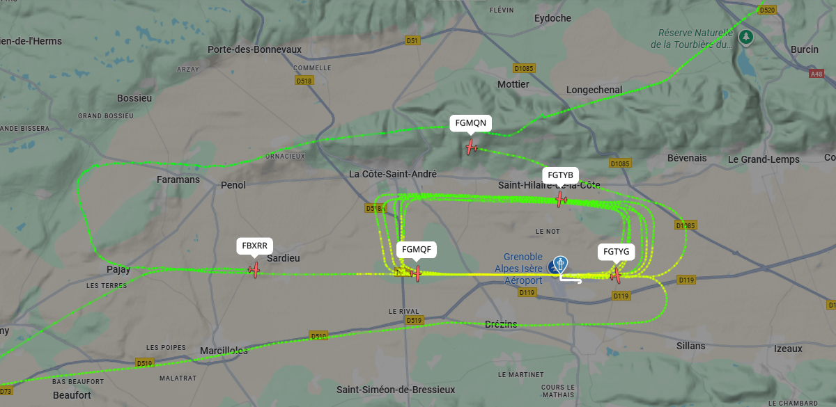 Grande amplitude de nuisances ce jour. Première nuisance de la journée à 3h20 du matin avec un décollage et passage sur Saint Hilaire de la Côte d’un Piaggio d’Oyonnair, et ce n’est pas la seule nuisance d’Oyonnair ce jour… Ce type de nuisances nocturnes n’existaient pas il y a encore quelques semaines… Toujours et encore plus de nuisances… Et encore une journée tours de piste, jusqu’à 4 avions (jusqu’à 6 avions avec les avions qui décollaient ou ne faisaient que passer), quasiment qu’au nord. Des tours de piste de l’Enac, du F-GBPK RENT AIR SERVICES, du F-BPHY de Morane, du F-HIYE aéroclub du Grand Lyon, du de l’aéroclub de Morestel F-BXRR, d’un Diamond (propriétaire non visible) et d’autres avions non visibles sur Flightradar. Des nuisances avec des passages et/ou 1 tour de piste de très nombreux avions basés (aéroclub de Grenoble, aéroclub du Dauphiné) et non basés (exemple : Aeropyrénées valence F-GELM de Valence, Enac, avions en approche sur Lyon, hélicoptères, aéroclubs extérieurs). Dernières nuisances avec des tours de piste du F-GNXT de l’aéroclub du Dauphiné jusqu’à 20h30.
