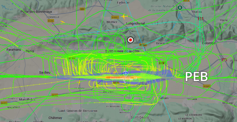 Visuel non représentatif de la réalité, perte fréquente de signaux et vols non visibles sur Flightradar. * PEB : Plan d’exposition au bruit, absolument non représentatif de la réalité.