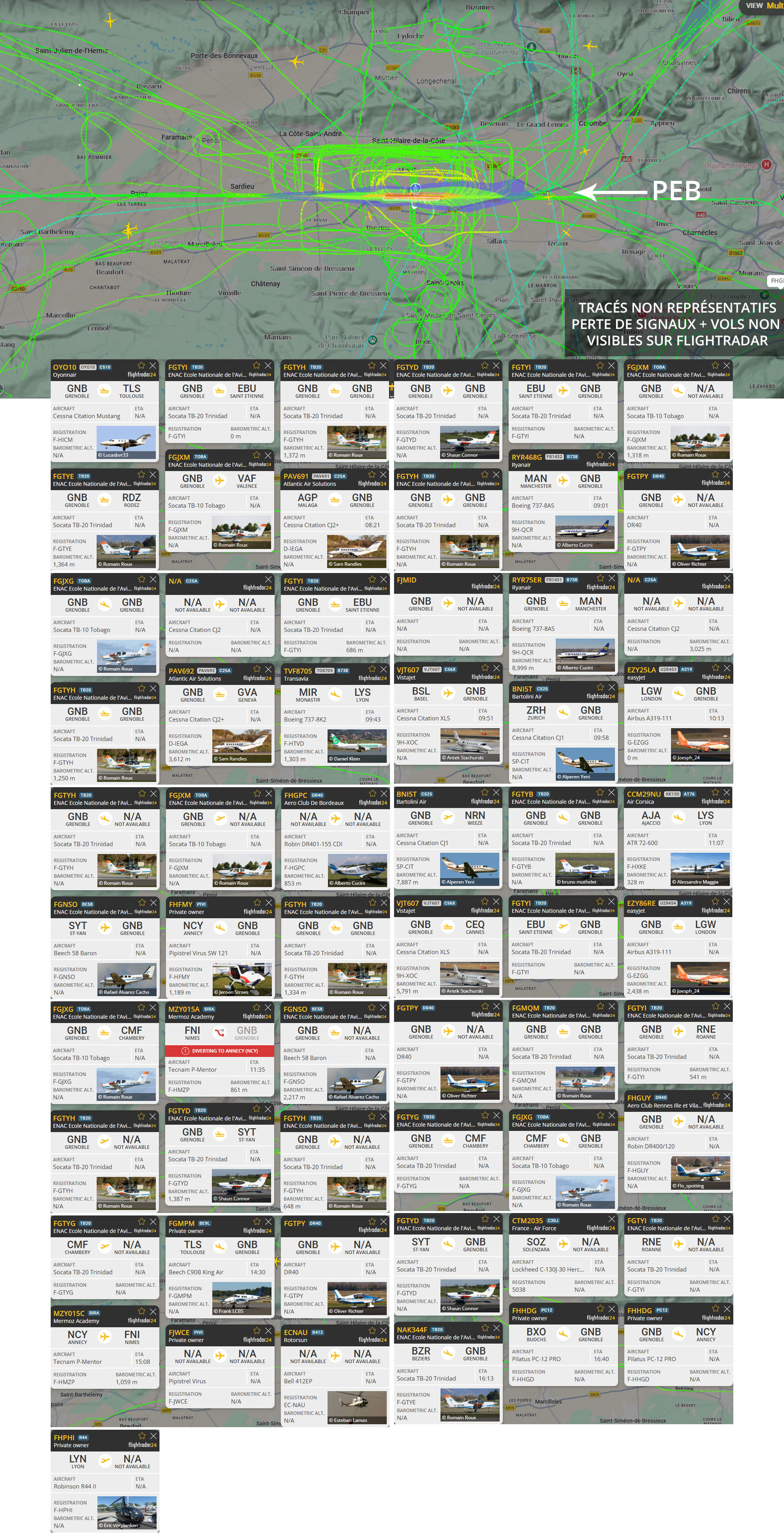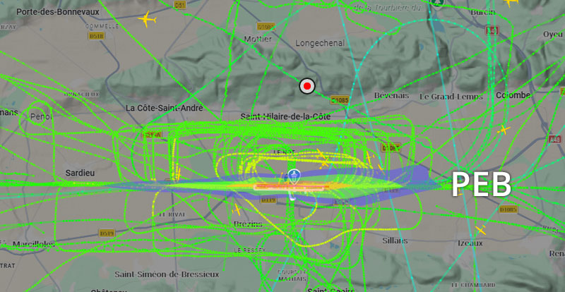 Visuel non représentatif de la réalité, perte fréquente de signaux et vols non visibles sur Flightradar. * PEB : Plan d’exposition au bruit, absolument non représentatif de la réalité.