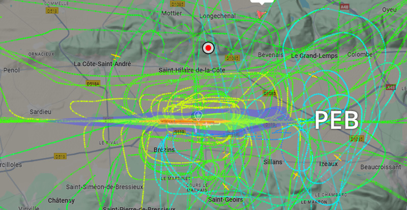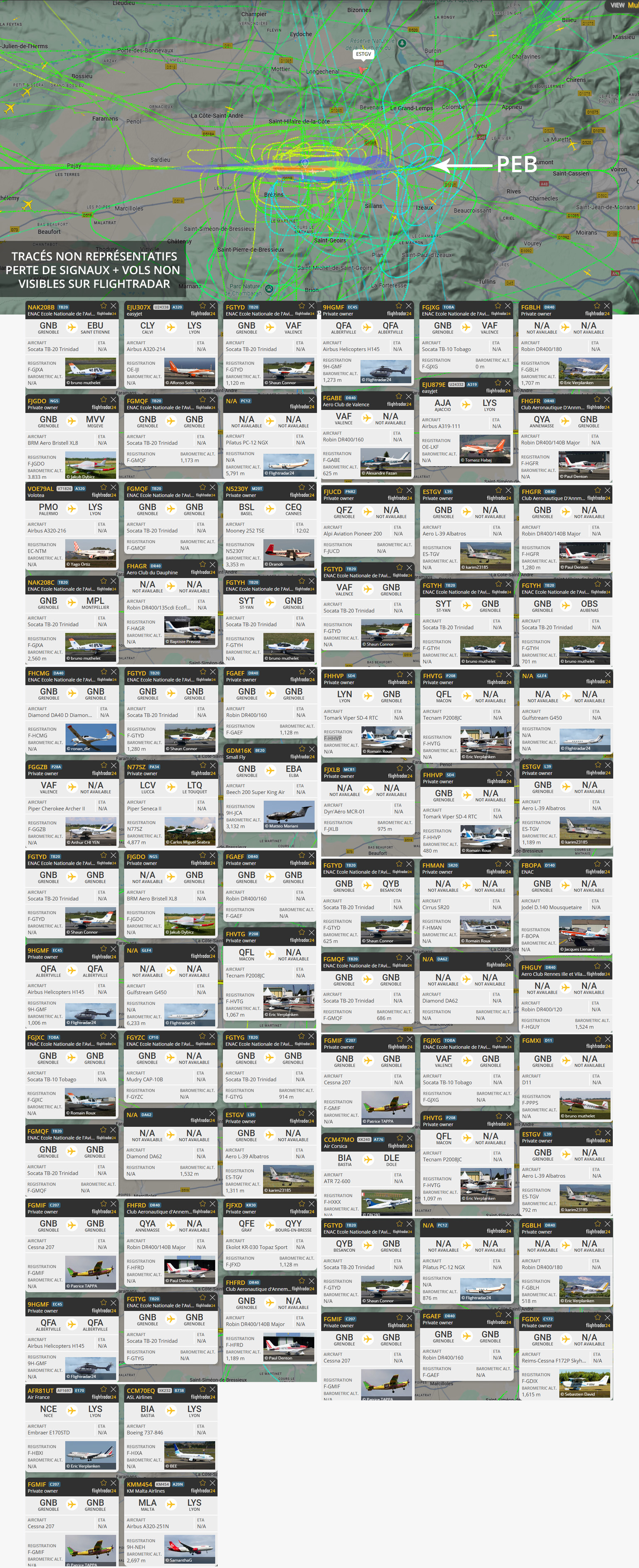 Visuel non représentatif de la réalité, perte fréquente de signaux et vols non visibles sur Flightradar. * PEB : Plan d’exposition au bruit, absolument non représentatif de la réalité.