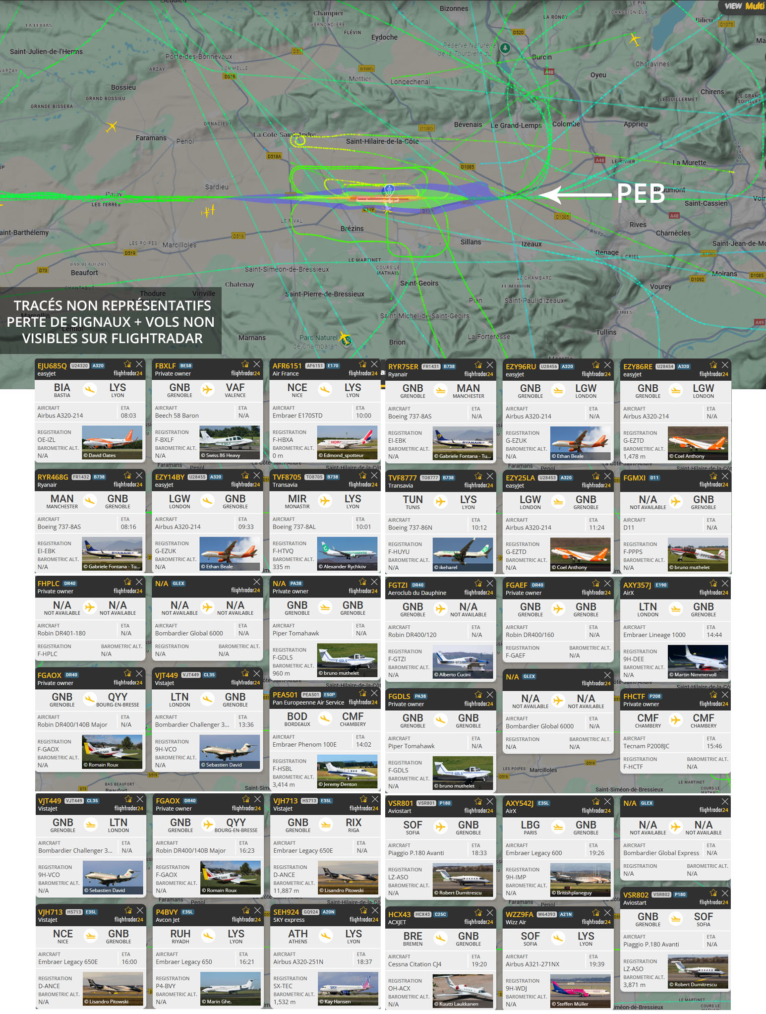 Visuel non représentatif de la réalité, perte fréquente de signaux et vols non visibles sur Flightradar. * PEB : Plan d’exposition au bruit, absolument non représentatif de la réalité.