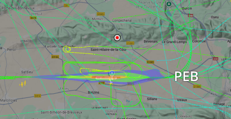Des nuisances un peu toute la journée. De nombreux avions de loisir, basés et non basés, visibles et non visibles sur Flightradar (le visuel ne représente donc pas du tout la réalité) : F-GTZI aéroclub du Dauphiné, F-GAEF aéroclub de Grenoble, F-PPPS aéroclub de Vienne, F-HPLC aéroclub Lyon Corbas, F-HCTF Avialpes Annecy, F-BXLF Beech Baron Valence, F-GDLS Valence… Des tours de piste visibles (F-GDLS Valence) et non visibles. Des nuisances d’hélicoptères non visibles, d’avions commerciaux, d’un Piaggio d’Aviostart.
