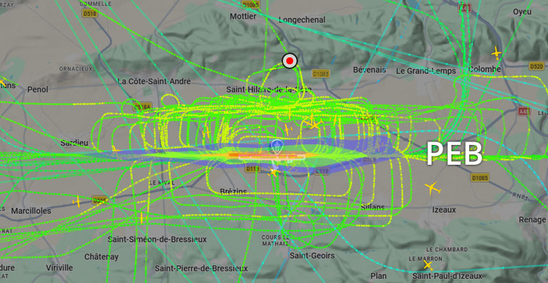 Visuel non représentatif de la réalité, perte fréquente de signaux et vols non visibles sur Flightradar. * PEB : Plan d’exposition au bruit, absolument non représentatif de la réalité.