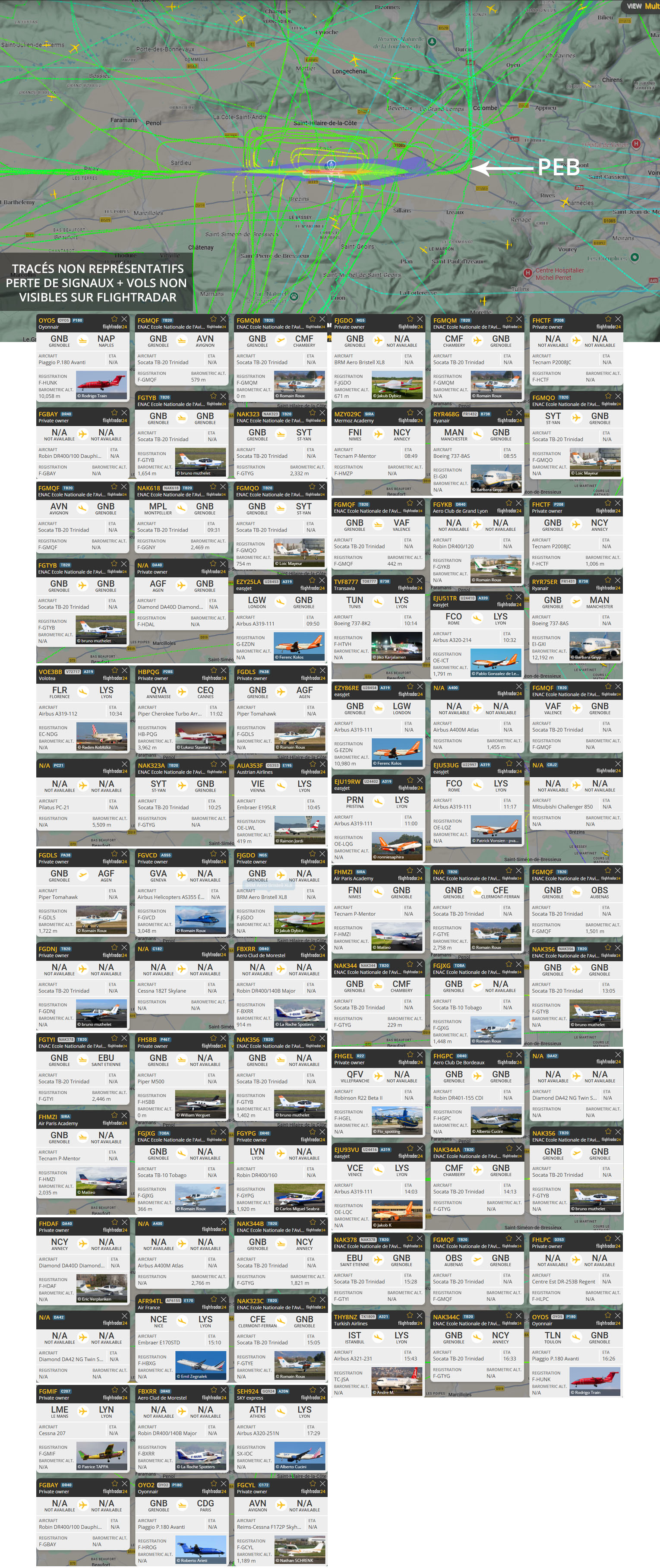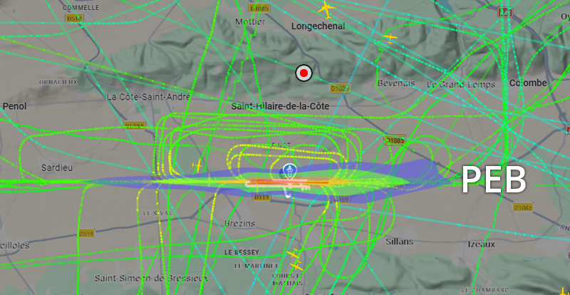 Visuel non représentatif de la réalité, perte fréquente de signaux et vols non visibles sur Flightradar. * PEB : Plan d’exposition au bruit, absolument non représentatif de la réalité.