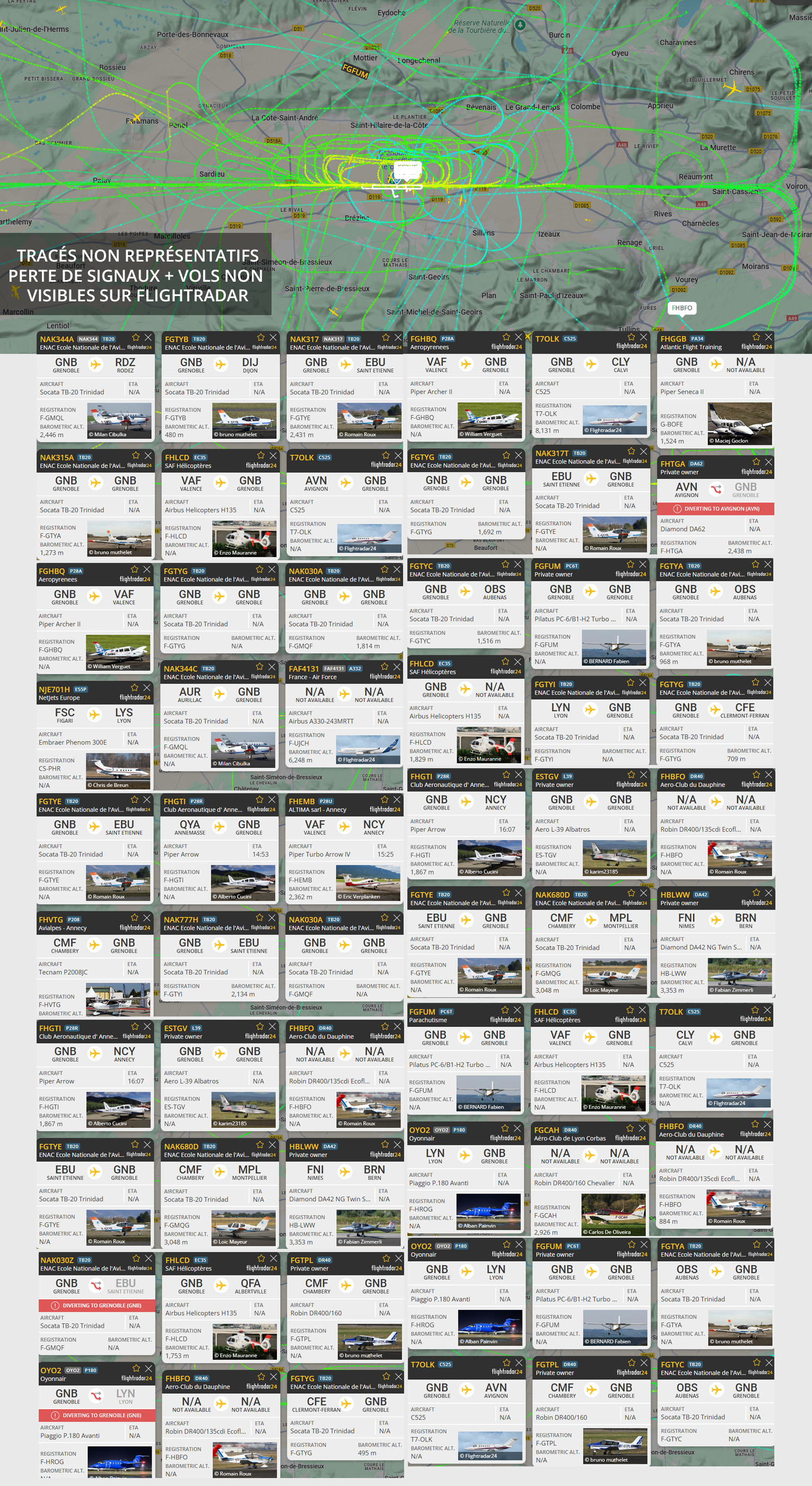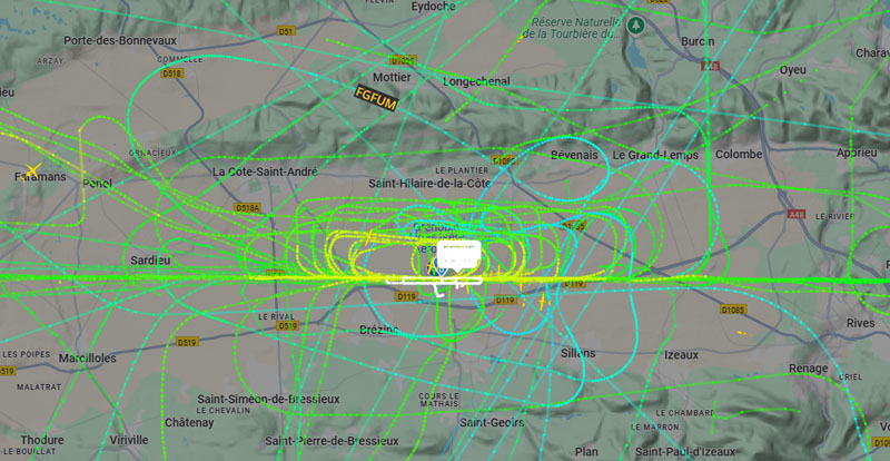 Des nuisances toute la journée avec une matinée et fin d’après-midi très bruyantes. Des tours de piste de l’Enac, d’Aeropyrénés, d’Oyonnair, des passages à basse altitude sur les hauteurs. Des visites d’écoles extérieurs (notamment Atlantic Flight Training), des nuisances des parachutistes F-FGUM et d’hélicoptères (dont le F-HLCD)… Visuel non représentatif de la réalité, perte fréquente de signaux et vols non visibles sur Flightradar.