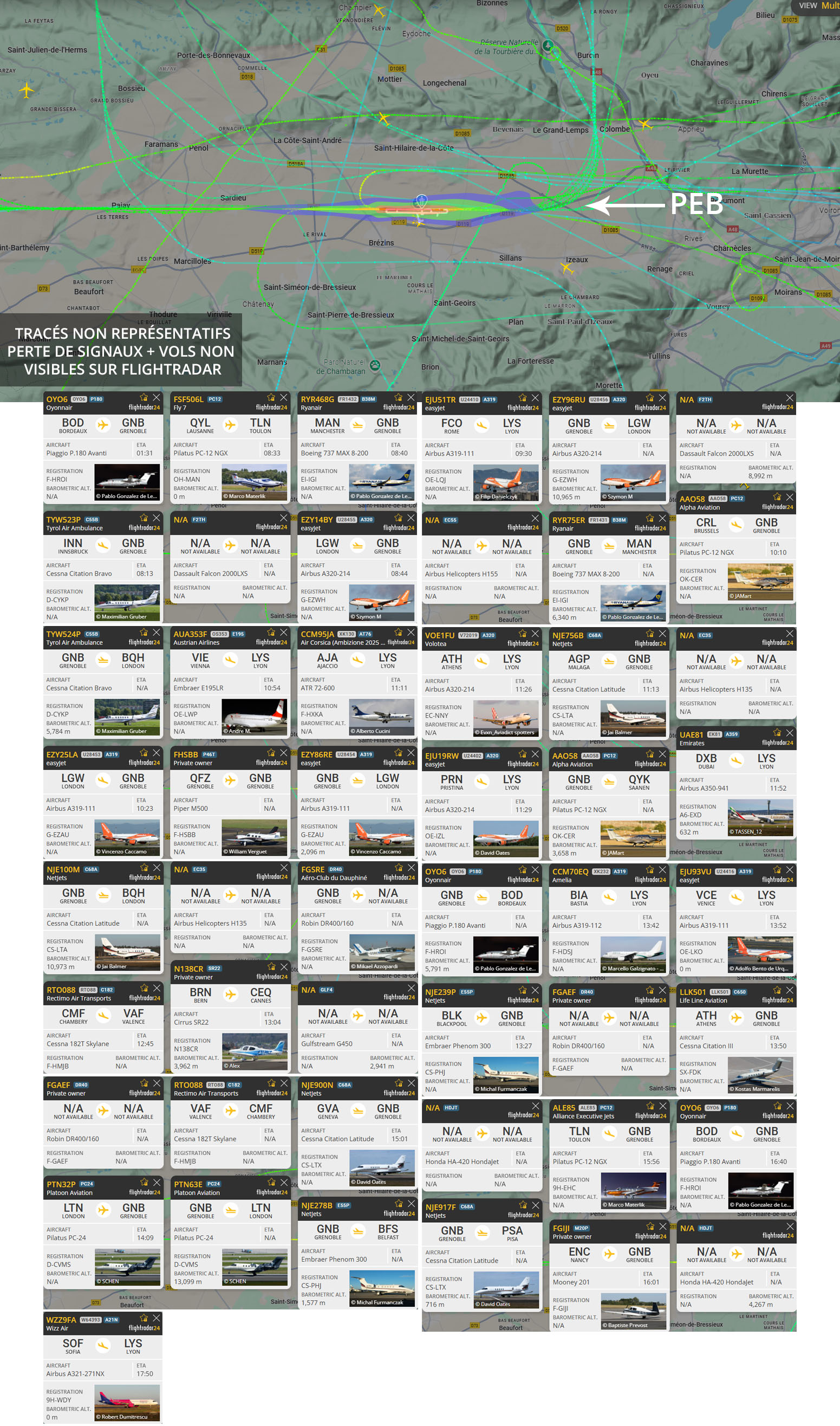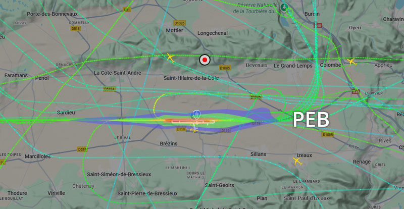Visuel non représentatif de la réalité, perte fréquente de signaux et vols non visibles sur Flightradar. * PEB : Plan d’exposition au bruit, absolument non représentatif de la réalité.