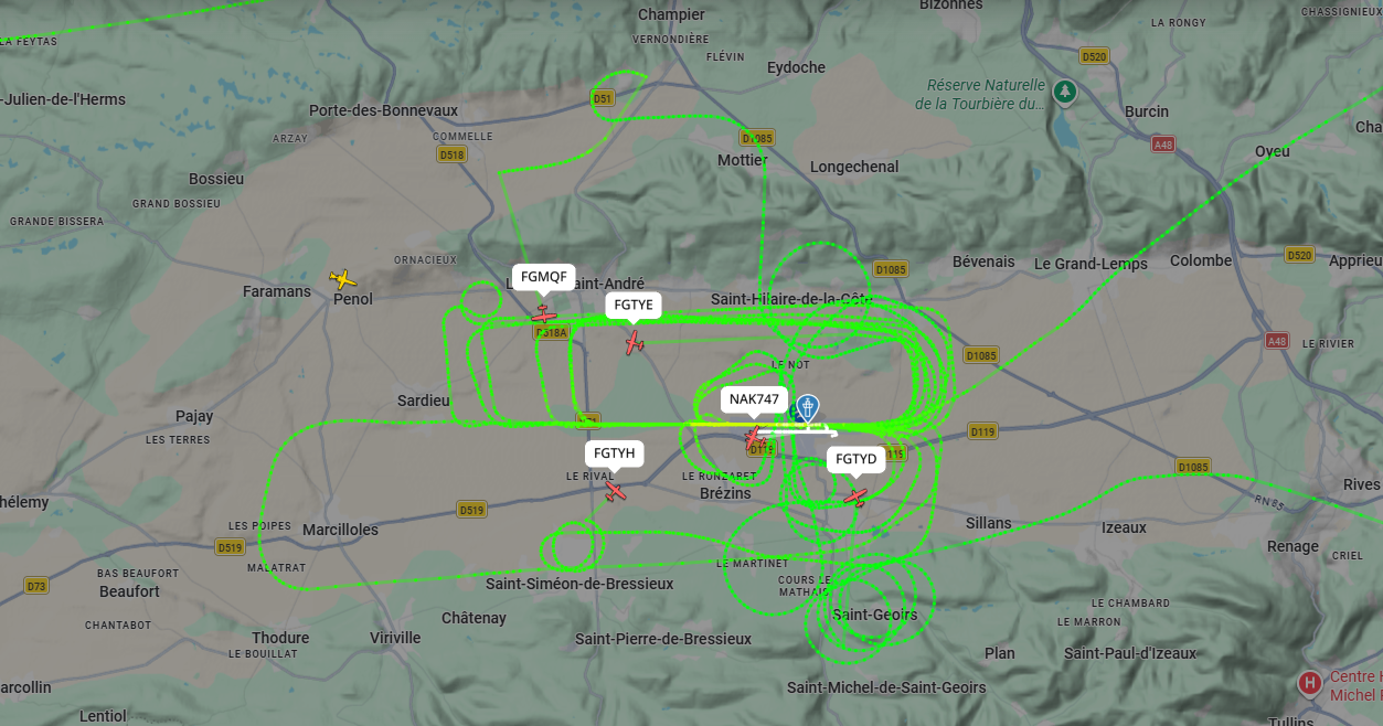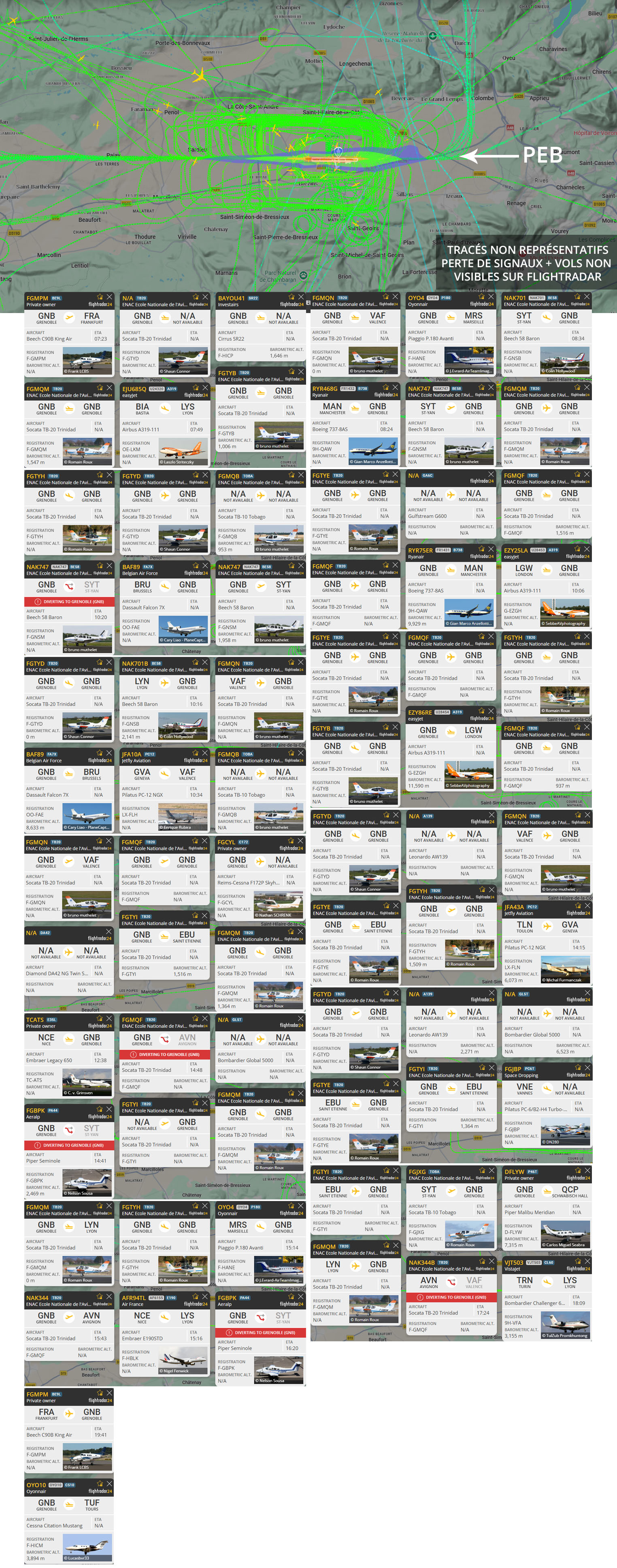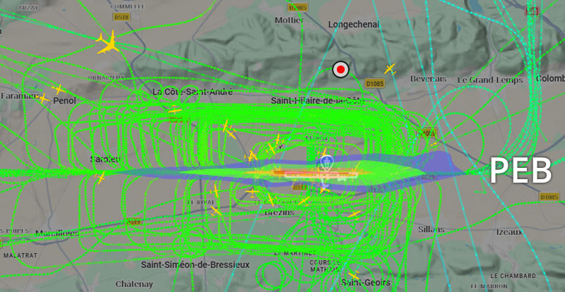 Visuel non représentatif de la réalité, perte fréquente de signaux et vols non visibles sur Flightradar. * PEB : Plan d’exposition au bruit, absolument non représentatif de la réalité.